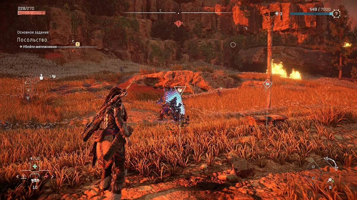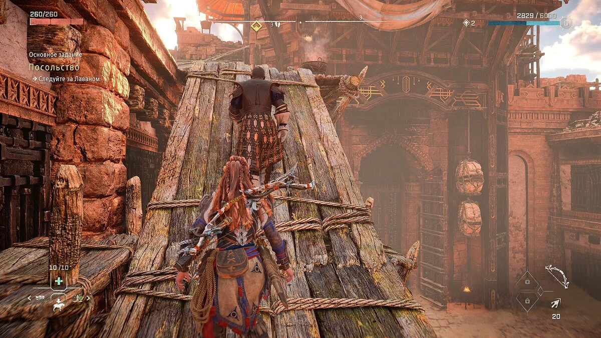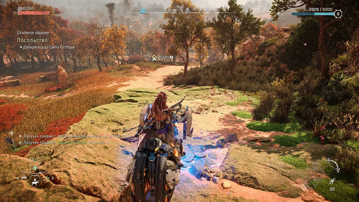 После боя осталось много полезного, не забудьте собрать все припасы. Так как посольства больше нет, Элой отправляется на запад в одиночку. Трофейный щит девушка решает использовать как планер.