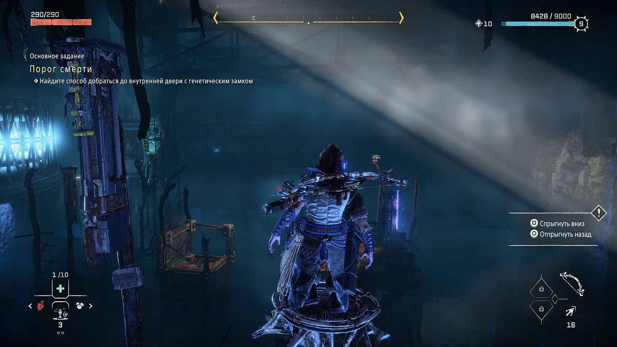 Проходите в новый зал, открыв копьем дверь. Все затоплено, поэтому до следующего генетического замка на другой стороне придется лезть. Слева от входа есть ресурсы. Перепрыгните на платформу дальше, если полезете направо по торчащим из воды сваям — доберетесь до сундука.