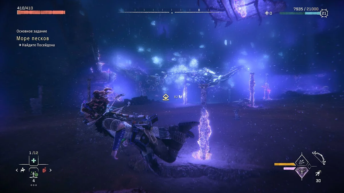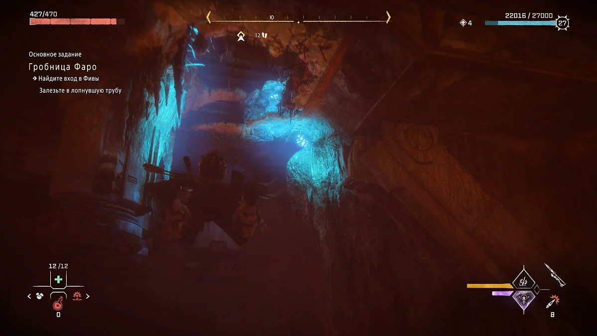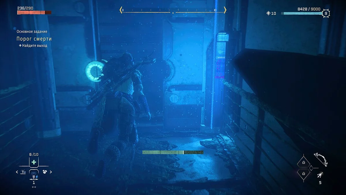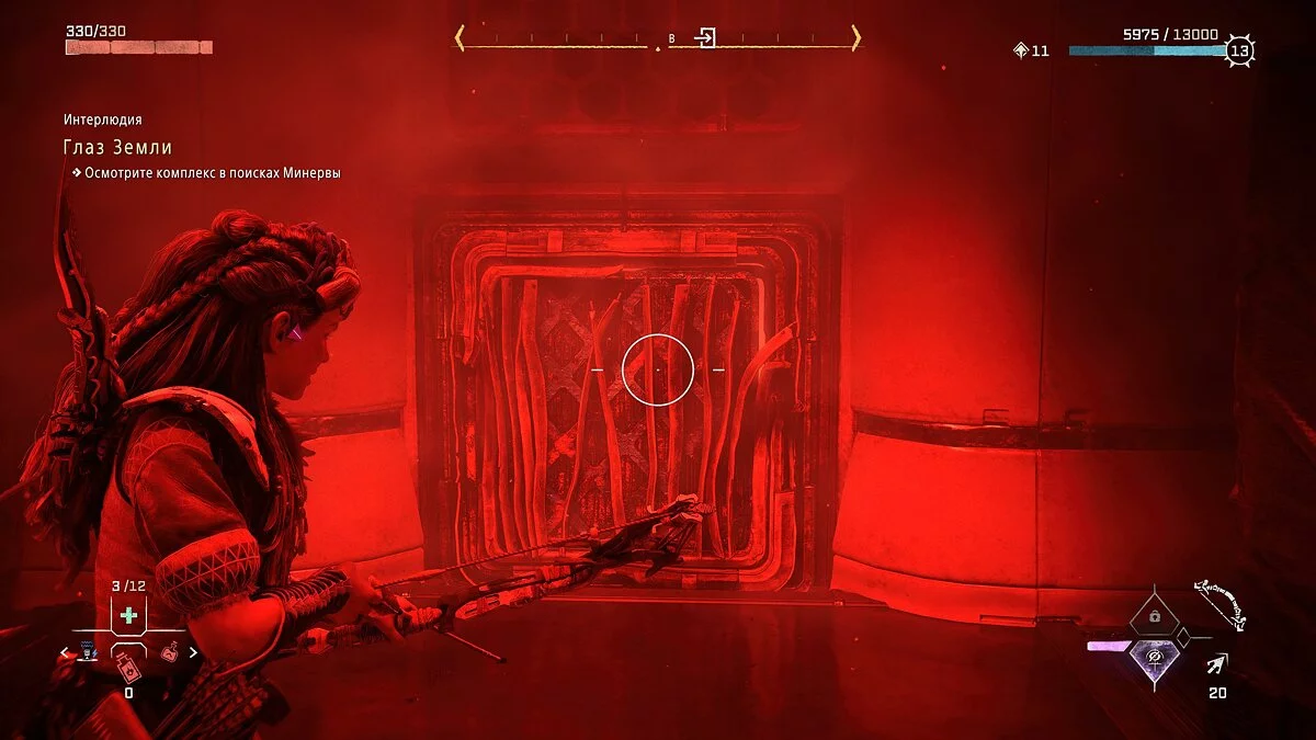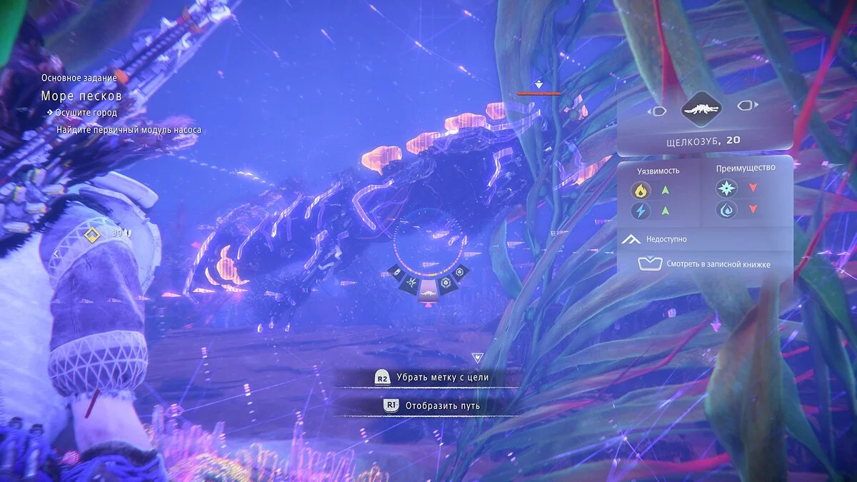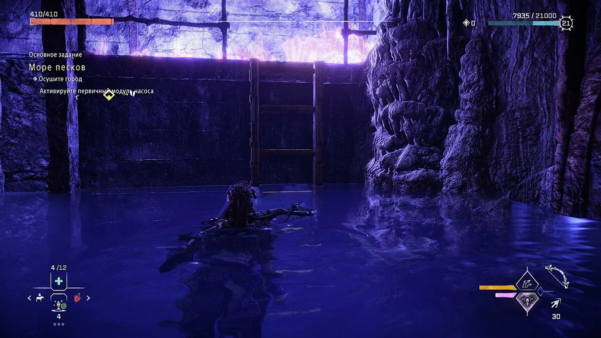 После нескольких попыток Элой вспомнит про красный огонек тревоги, о котором говорил один из трофейщиков. От входа в зал плывите направо к красному свечению. Его лучше видно на высоте, поэтому не прижимайтесь ко дну. В итоге вы найдете панель управления. Город можно осушить, но необходимо найти два модуля насоса. В следующем помещении будут новые машины, похожие на больших крокодилов. Прячьтесь от них в водорослях, иначе мимо не пройти.