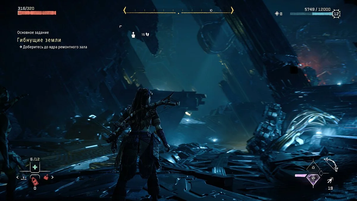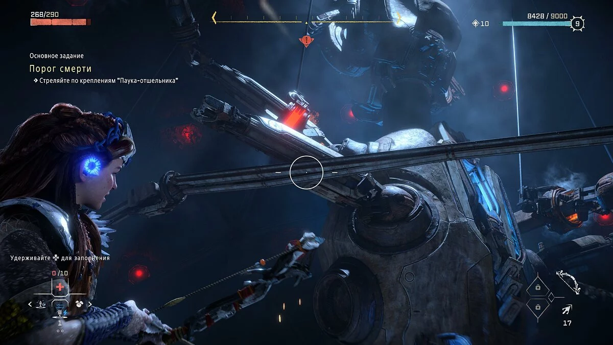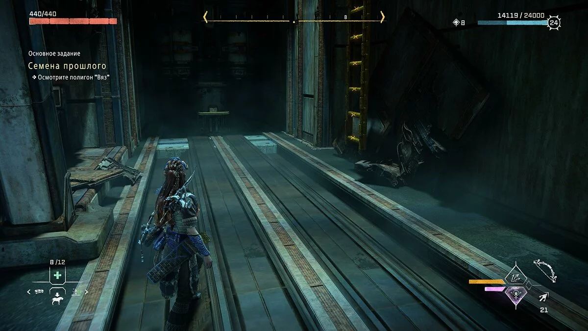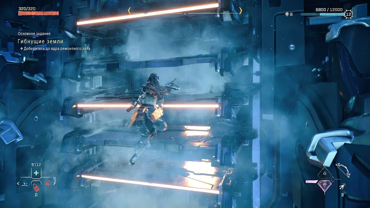 Воспользовавшись тросом, Элой приземлится на железную конструкцию, которая начнет разрушаться. Быстро перепрыгните по балкам на устойчивую поверхность. Вы окажетесь в просторной локации с несколькими слабыми машинами. После боя идите к маркеру — это пульт управления зажимами челнока.