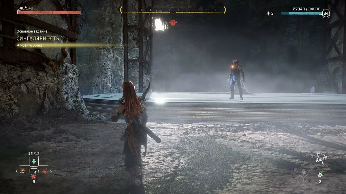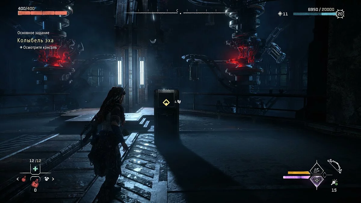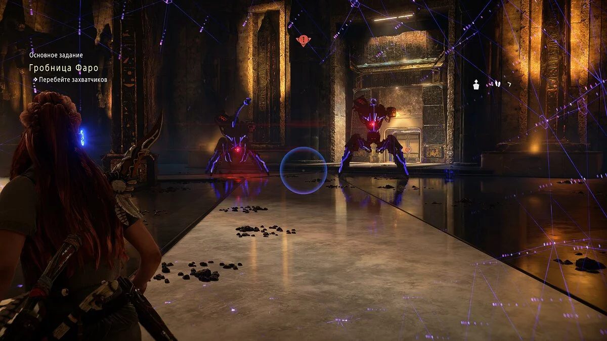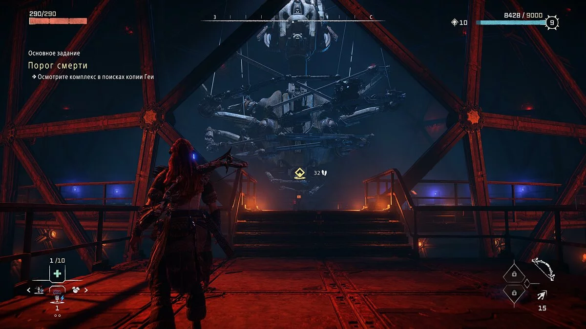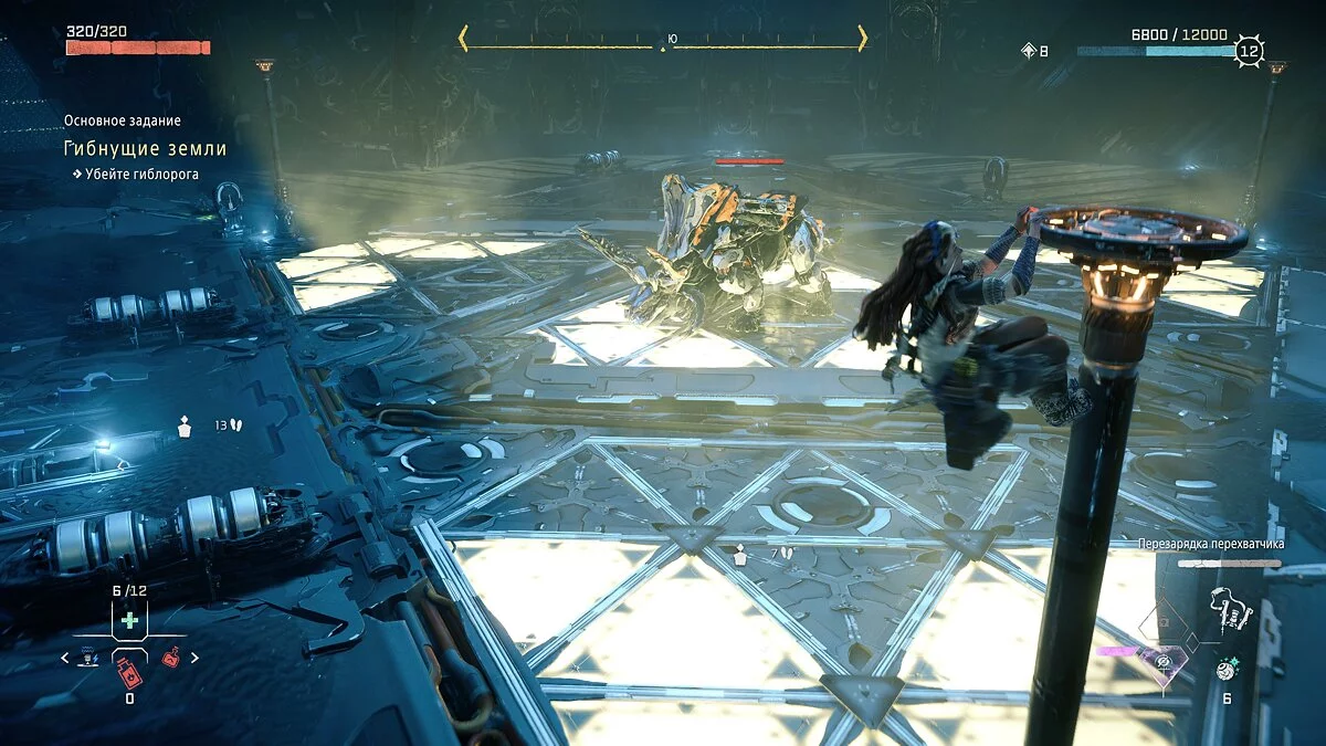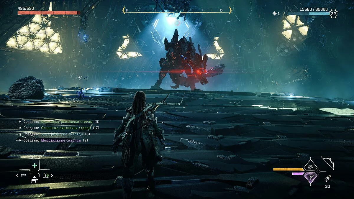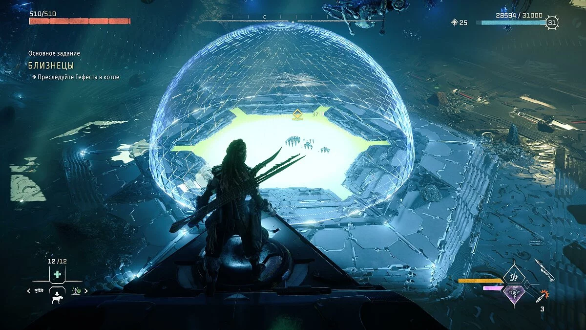 Долетите на машине до следующего помещения — вам нужно к узлу в центре. Также в комнате три робота. Как только вы с ними разберетесь — активируйте узел, однако Гефест заблокирует Элой и вызовет еще три машины. Советуем не спускаться с платформы — так победить будет проще.