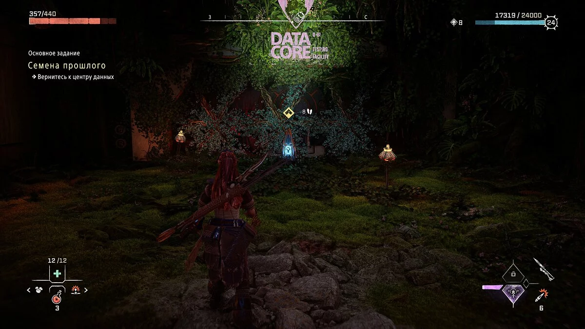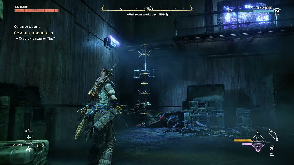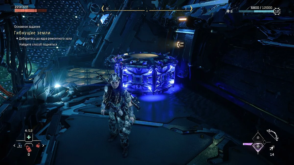 Справа от выхода с арены заберите ресурсы. Продолжая следовать маркерам, посмотрите голограмму о произошедших событиях и получите программу для железных цветов. По совету Альвы возвращайтесь в лагерь Квен и используйте верстак для улучшения копья.