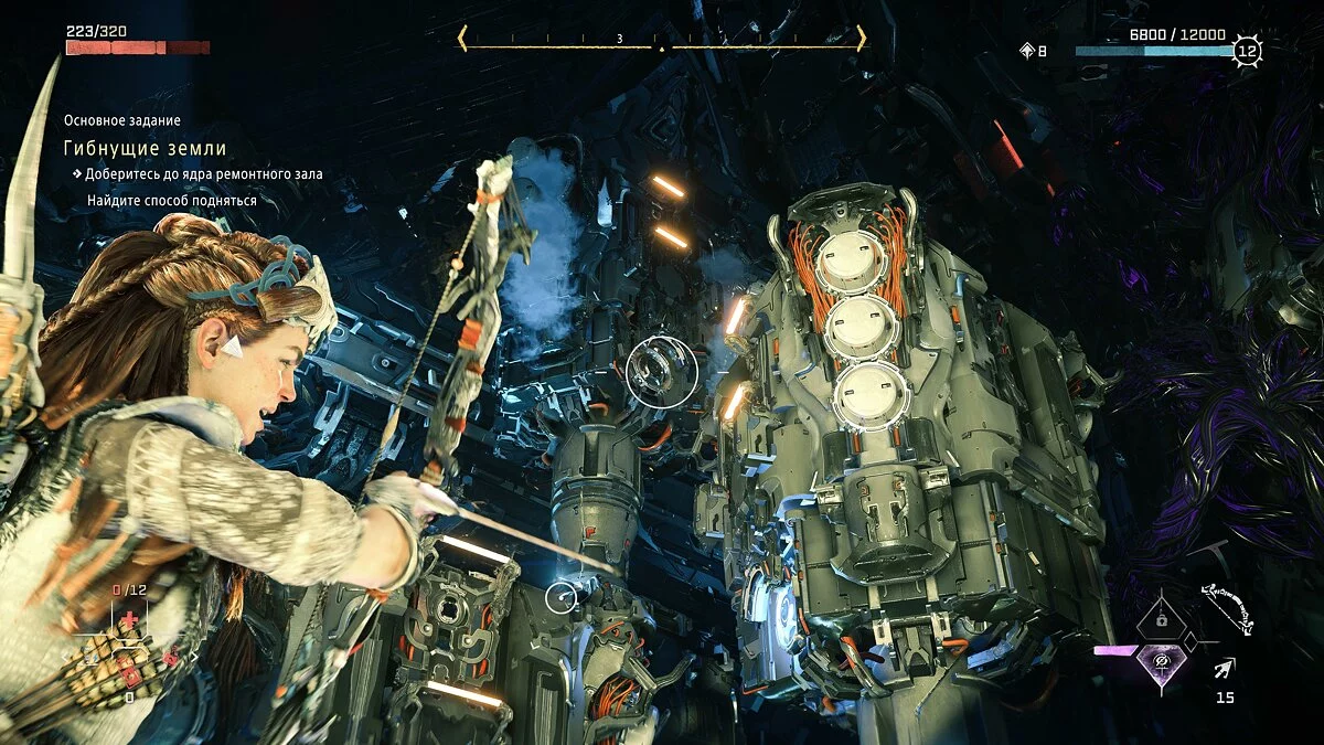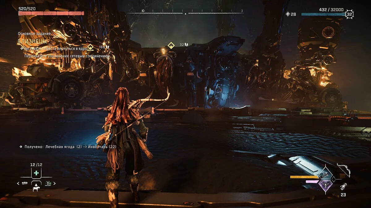 Продолжая движение, вы столкнетесь с двумя неизвестными машинами. Просканируйте их визором, чтобы найти слабые места. Попадая в них, Элой наносит огромный урон. Не забудьте собрать ресурсы с останков.