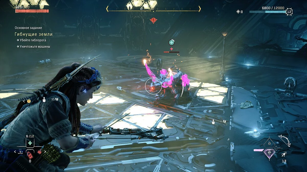 На арене есть немного ресурсов, которые помогут в бою. Также не забудьте использовать визор и концентрацию — без этого попасть по роботу будет очень сложно.