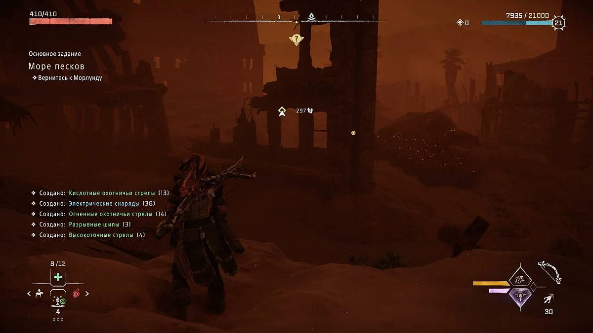 Начнется песчаная буря, поэтому видимость серьезно снизится. Прежде чем нагнать стадо, придется сразиться с двумя «морозными коршунами». Бейте их в грудь огненными стрелами, и проблем не возникнет. Также разберитесь с двумя «норокопами».