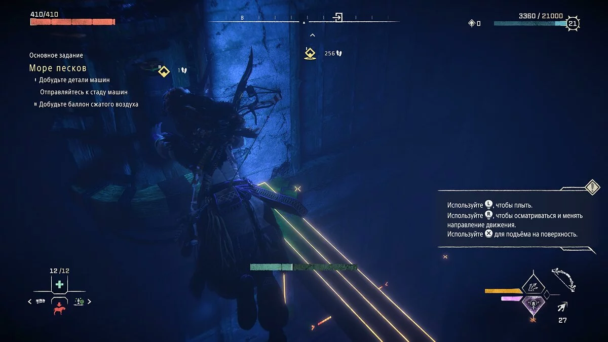Ныряйте на глубину и плывите к маркерам цели. Вы столкнетесь с огромной машиной, похожей на динозавра. Нападать она не станет, однако от ее лап образуется слишком сильный поток воды, который будет сносить Элой в сторону. Сражаться под водой бесполезно, придется проскользнуть мимо.