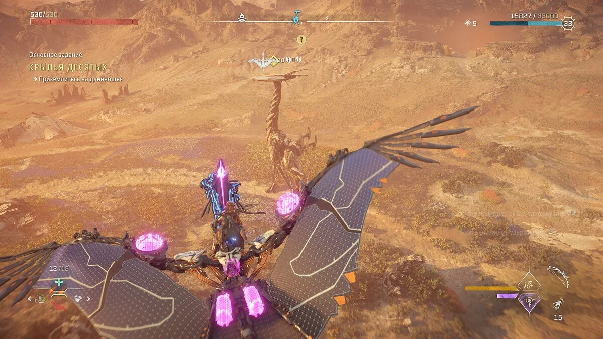 Летите на запад к длинношею. Если вы целенаправленно открывали карту — это единственный длинношей с замком на иконке. Приземлитесь прямо на его голову, чтобы открыть последний кусок карты и выпустить энергетический импульс. Затем летите к старому титану и заберите на его спине энергоячейку. Следуйте к цели и смотрите кат-сцену.