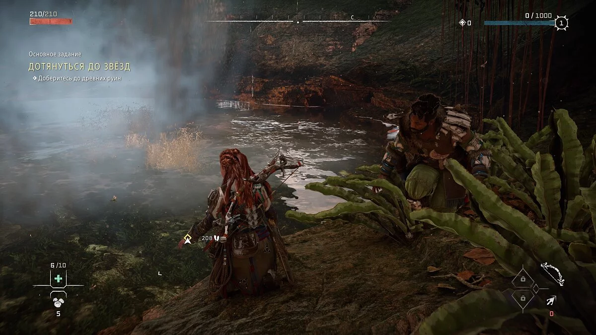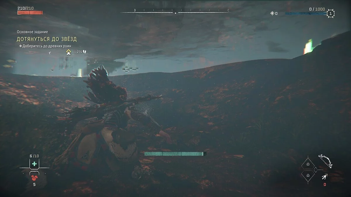 В оригинальной Horizon Zero Dawn не было подводных локаций, они появились только в Forbidden West. Уже в самом начале игры Элой умеет ненадолго задерживать дыхание. Этого достаточно, чтобы проплыть короткий участок на глубине или напасть на противника из-под воды. Однако если вы захотите исследовать подводные пещеры, то быстро выясните, что запаса кислорода вам явно не хватает. Для этого понадобится специальная маска.
