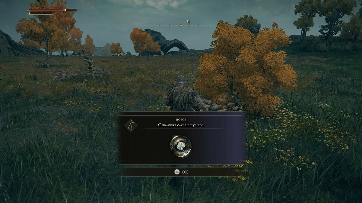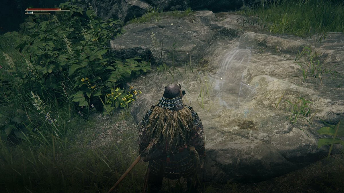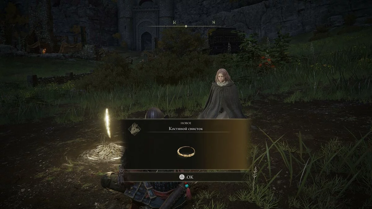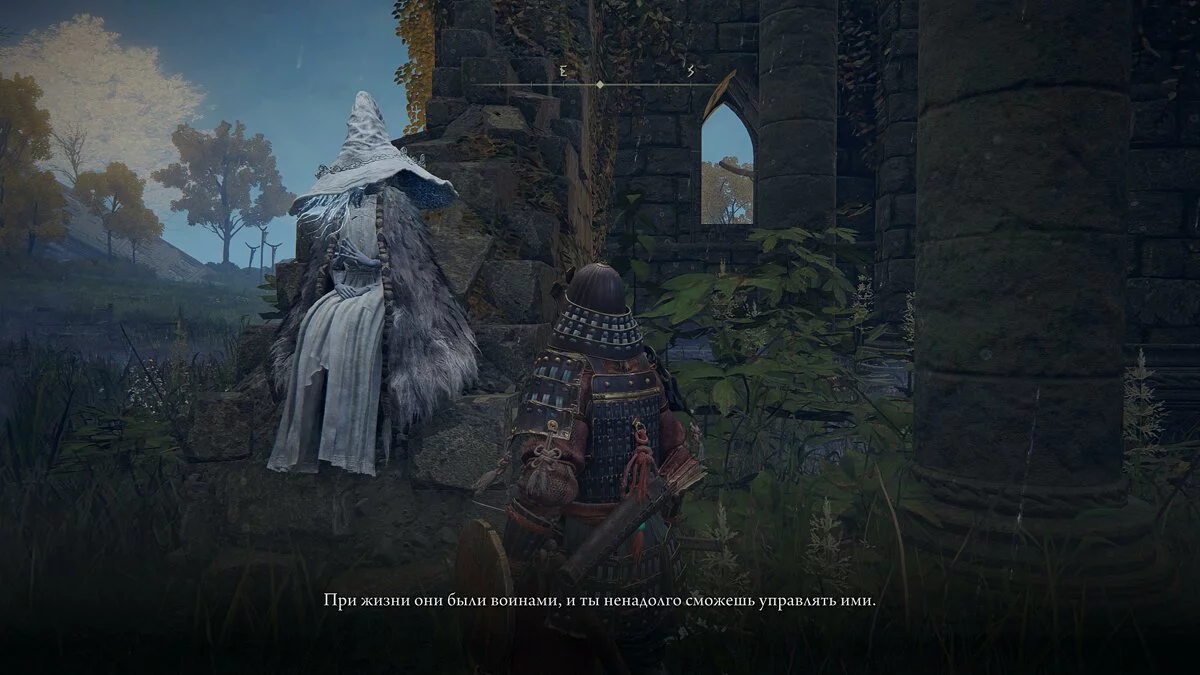 Выходим наружу и оказываемся в открытом мире. Идём по прямой до мужчины и активируем первое место благодати (аналог костра из Dark Souls). Общаемся с ним и получаем предметы для перемещения в чужие миры в качестве помощника: