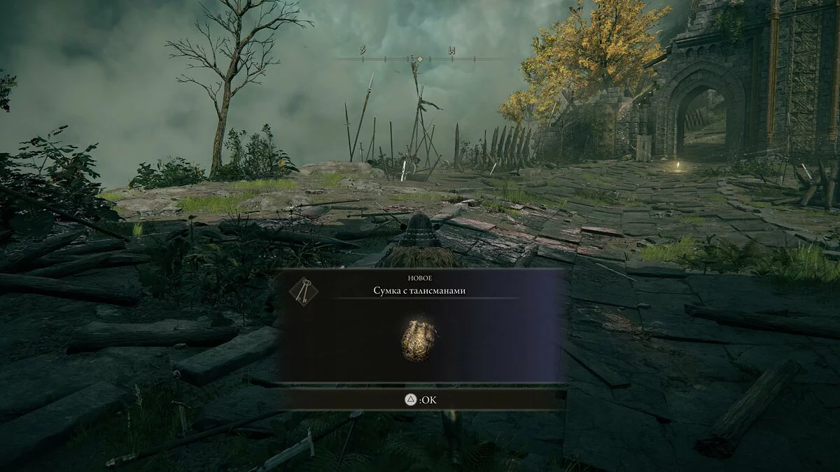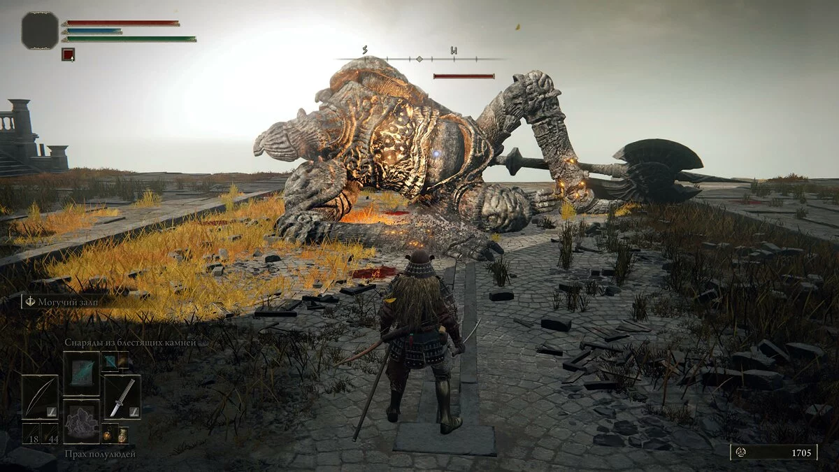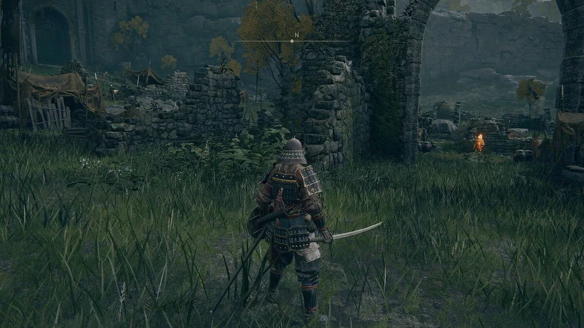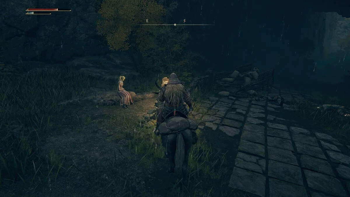 После встречи с девушкой двигаемся прямо по дороге. В кучке монстров найдём кузнечный камень у телеги и руну жителя окраин. Дальше по дороге уничтожаем шар и находим «Пепел войны: Могучий залп». Идём вперёд и за разрушенным строение найдём торговца и место благодати.