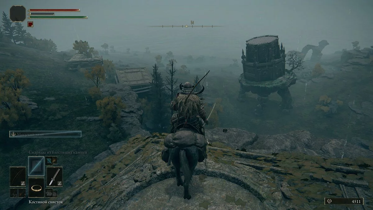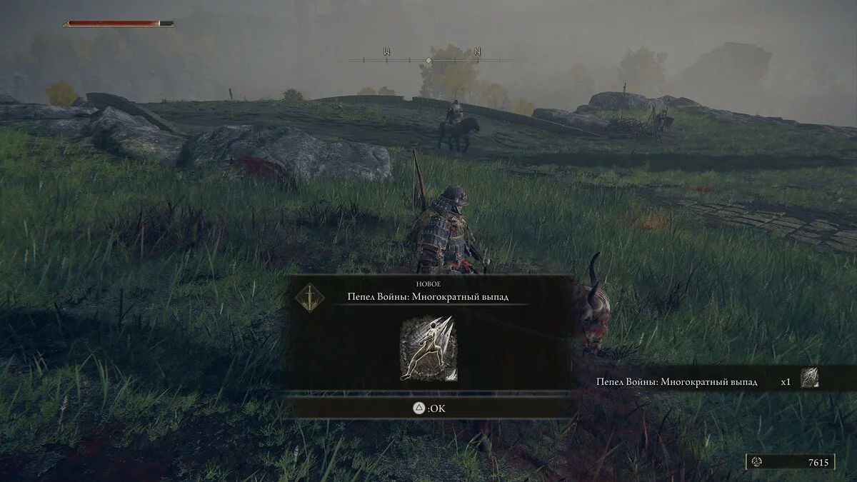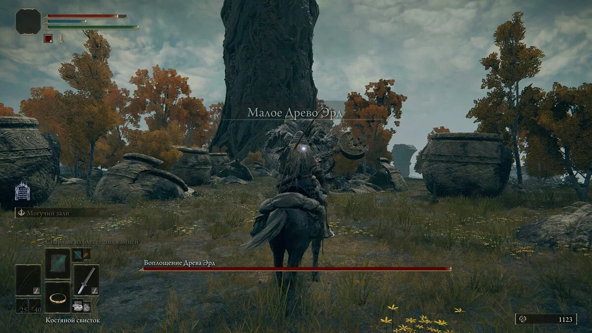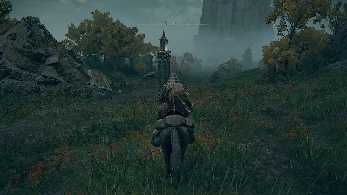 После встречи с девушкой двигаемся прямо по дороге. В кучке монстров найдём кузнечный камень у телеги и руну жителя окраин. Дальше по дороге уничтожаем шар и находим «Пепел войны: Могучий залп». Идём вперёд и за разрушенным строение найдём торговца и место благодати.