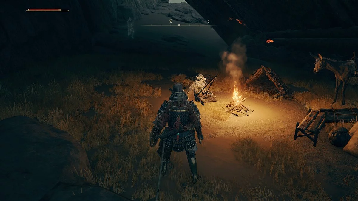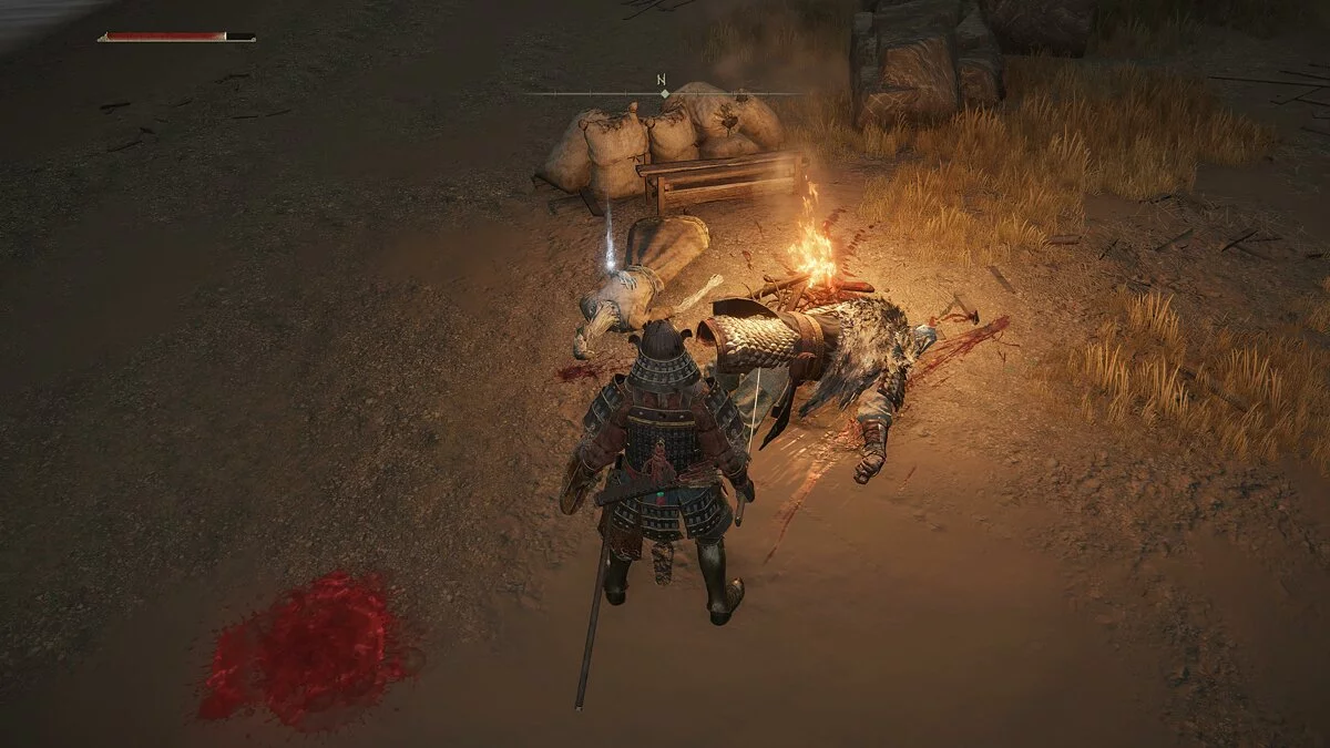 Тренируем стелс на рыцарях с факелами. Здесь же в кустах осматриваем останки. Слева от тропинки находим сидящего у костра противника.