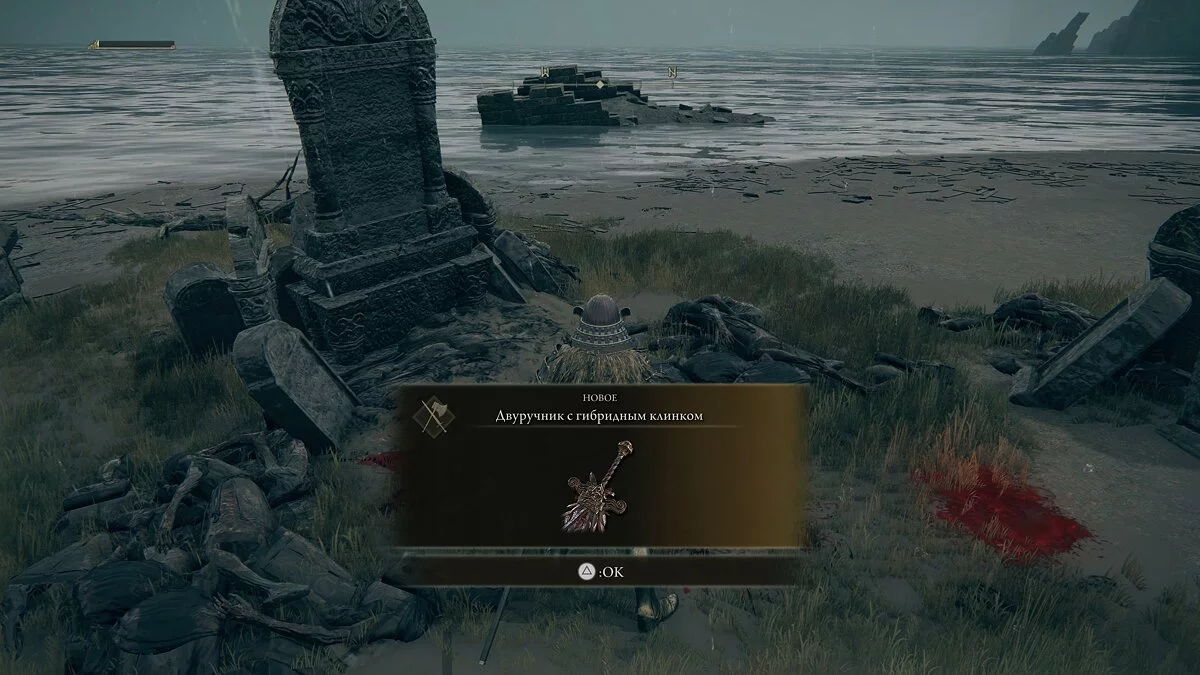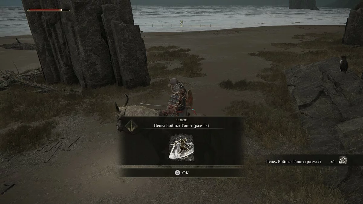 Спускаемся в самый низ к крайней части берега. Возле колонн заметим перемещающиеся белые следы на песке. Предугадываем дальнейший путь невидимого существа и используем атаку. Подбираем «Пепел Войны: Топот (размах)» для улучшения оружия.