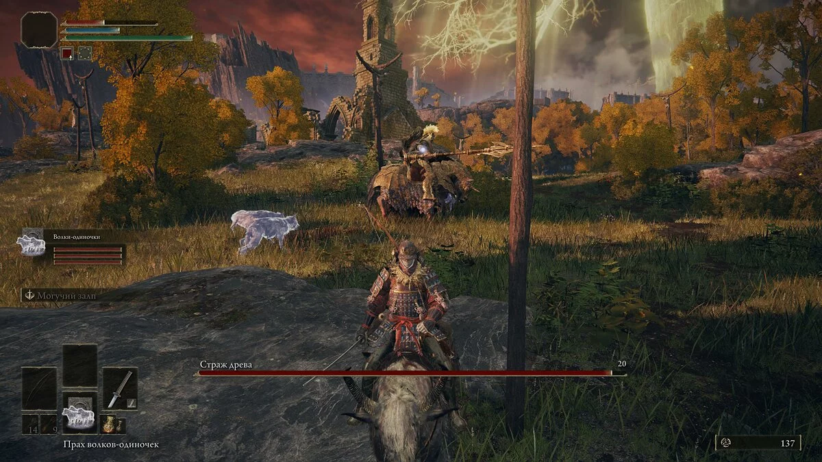 Возвращаемся к воротам, используем артефакт и проходим внутрь. На лифте поднимаемся внутрь локации и отправляемся на зачистку территории. Первым серьёзным противником окажется Алый волк Радагона. Мы рекомендуем заранее подготовиться к оппоненту, так как рядом отсутствует место благодати — после смерти игроку придётся заново пробегать через кладбище со скелетами. За убийство босса получим артефакт «Камень памяти».