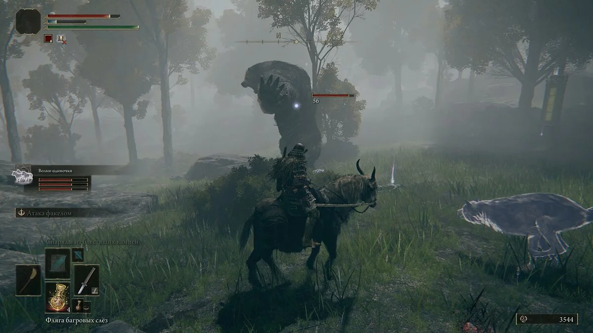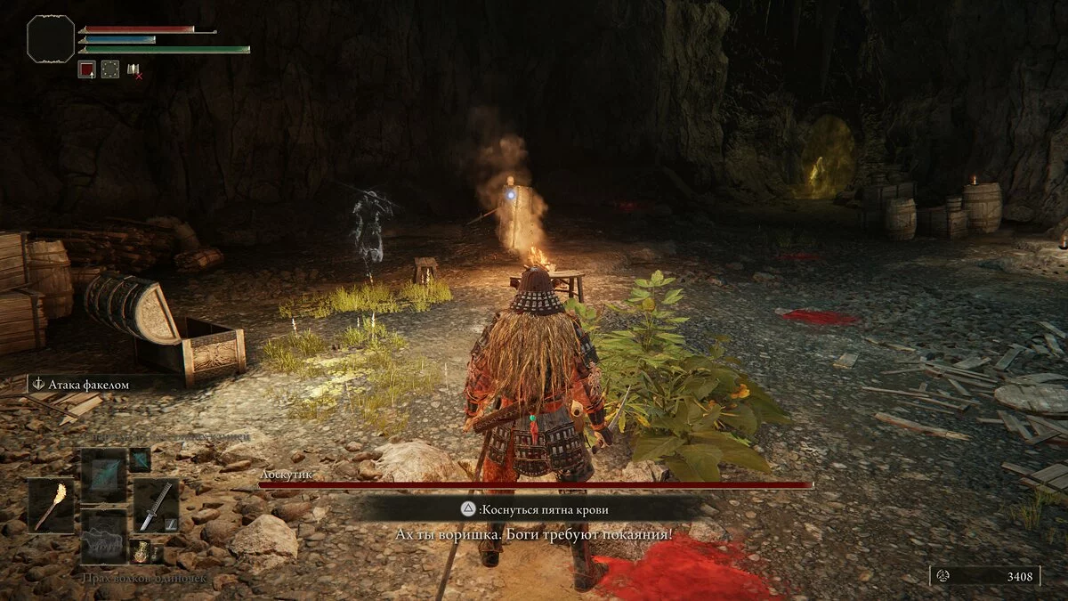 В пещере столкнёмся с волками — большая группа у костра, два возле светлячков у стены и один у прохода справа. Телепортируемся к торговцу, покупаем факел и возвращаемся назад. Если в пещере двигаться по правой стороне, то сразу выйдем к последнему волку и проходу к боссу. Двигаемся вперёд и пробираемся через туман.