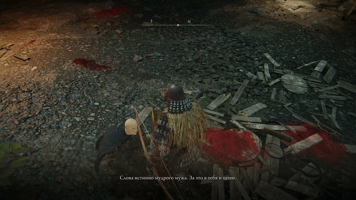 Следуем по тропе к разрушенному аванпосту. В нём очень много стражников, атаковать их всех сразу не получится. Старайтесь подходить к каждому противнику сзади, использовать удар со спины и добивать быстрыми атаками при необходимости. На центральной дороге ходит враг с рогом и воин с длинным копьём и большим щитом. Если первый затрубит в инструмент и поднимет тревогу, то весь аванпост начнёт охотиться на героя.