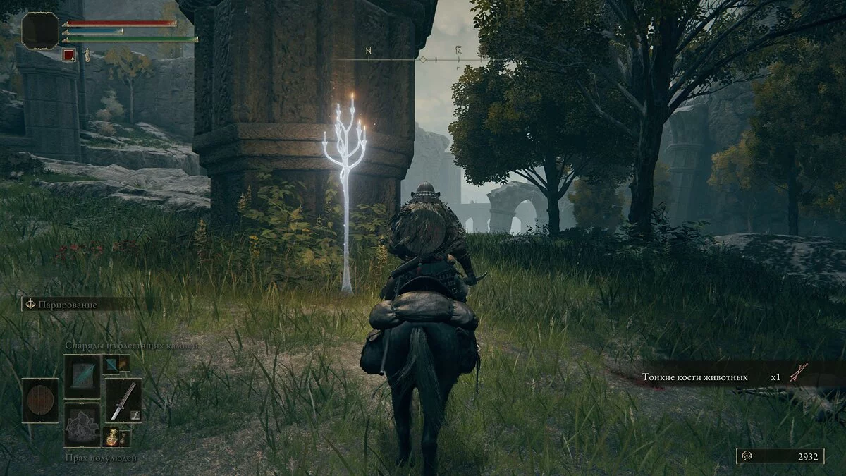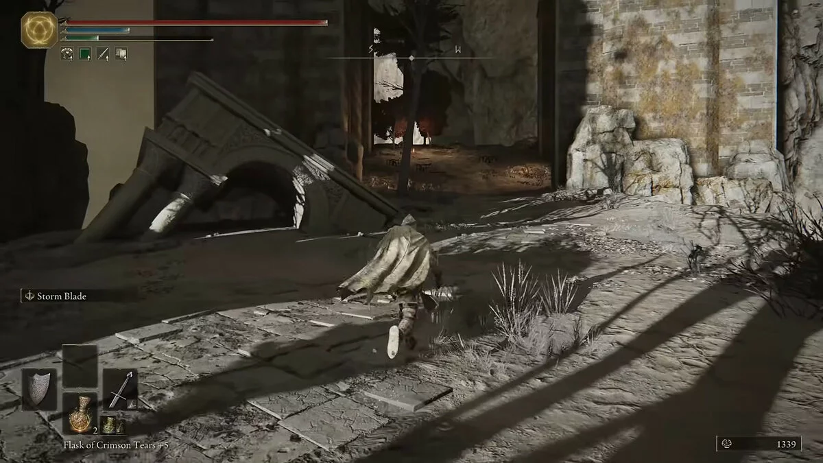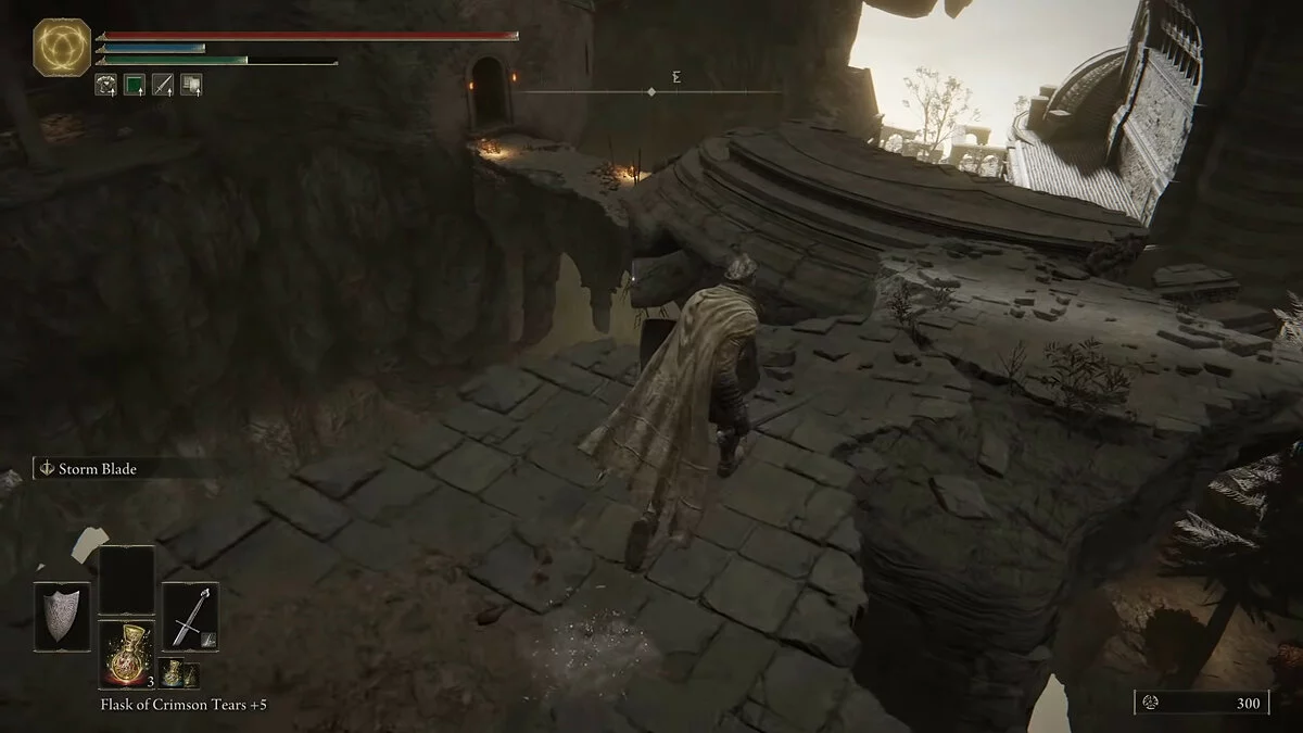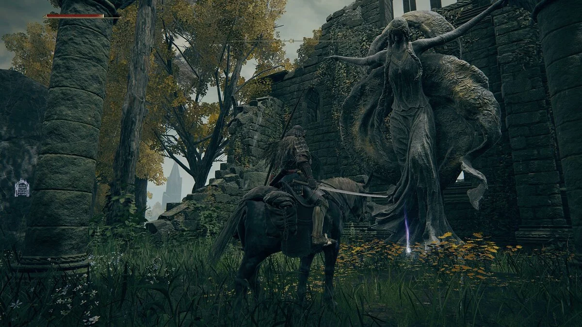 Обходим огромного монстра с правой стороны и идём в сторону разрушенного храма. Активируем место благодати. Здесь игрок сможет пообщаться с торговцем. Без рун (аналог душ из Dark Souls) прикупить что-то сразу мы не сможем. Двигаемся по тропинке в сторону рыцарей с факелами. Справа от дорожки за камнями обнаружим трёх летающих монстров. Они подойдут для тренировки уклонения.
