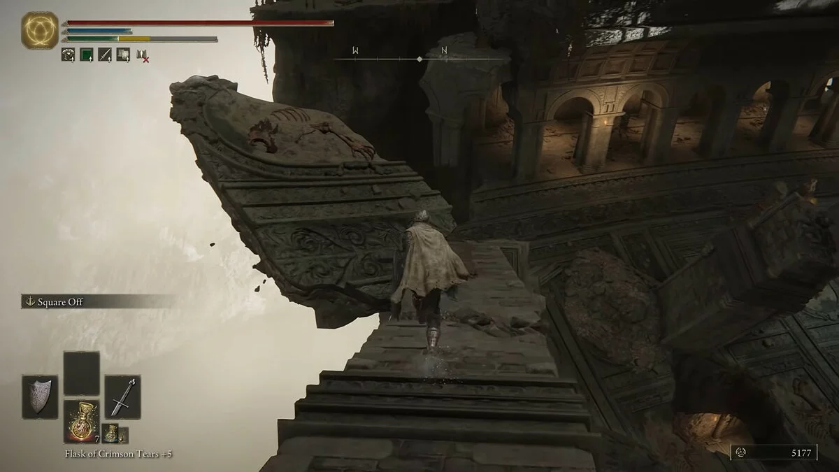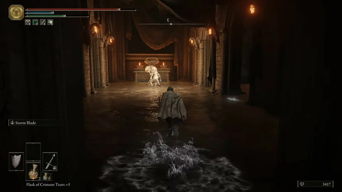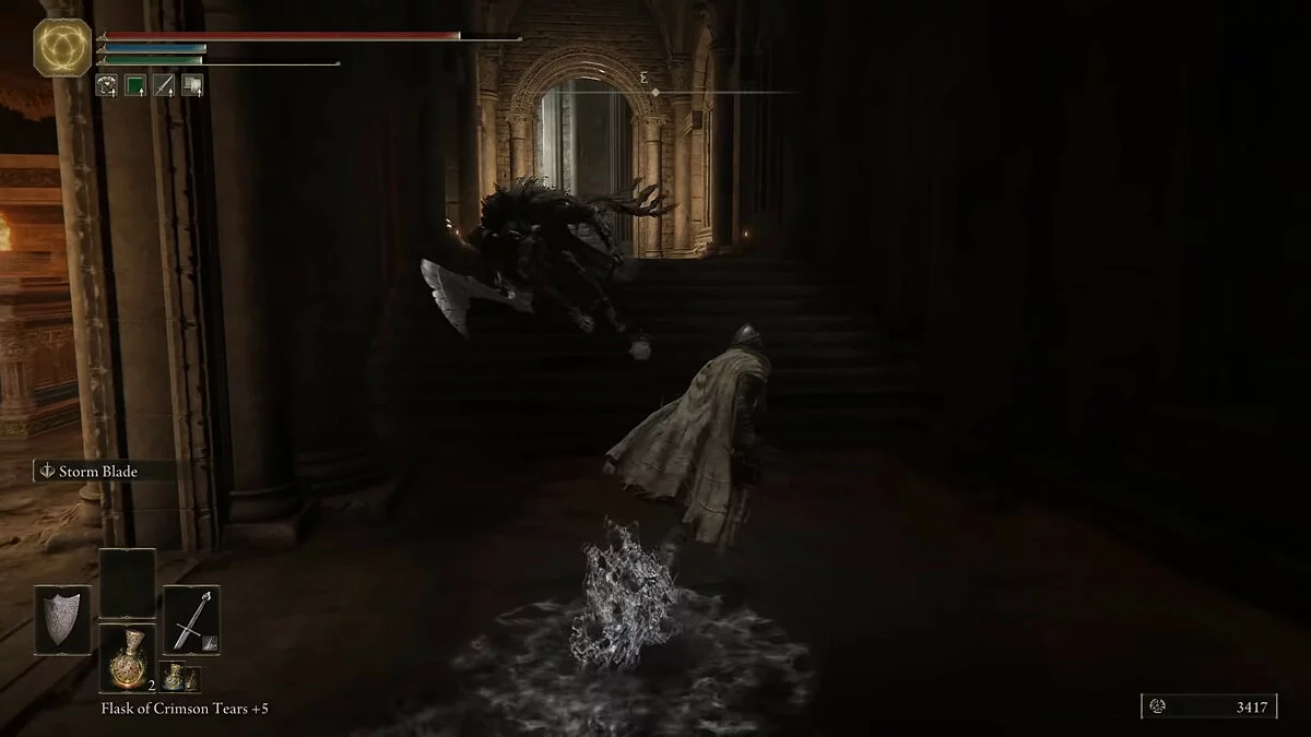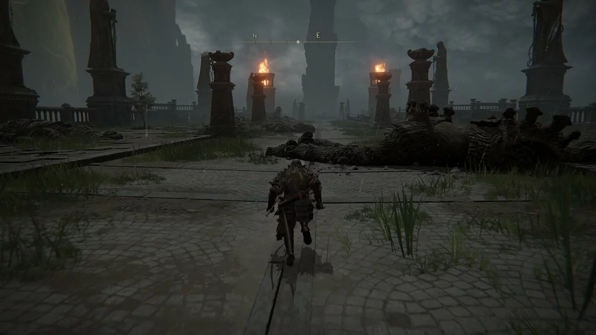 Обходим огромного монстра с правой стороны и идём в сторону разрушенного храма. Активируем место благодати. Здесь игрок сможет пообщаться с торговцем. Без рун (аналог душ из Dark Souls) прикупить что-то сразу мы не сможем. Двигаемся по тропинке в сторону рыцарей с факелами. Справа от дорожки за камнями обнаружим трёх летающих монстров. Они подойдут для тренировки уклонения.
