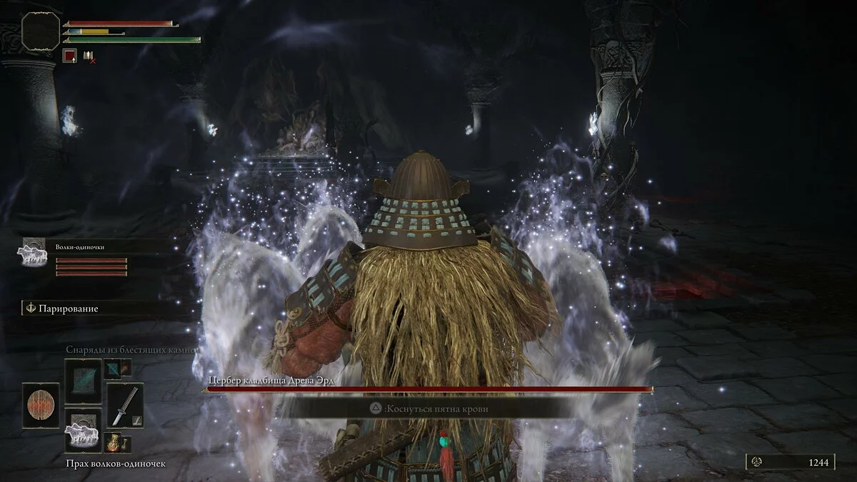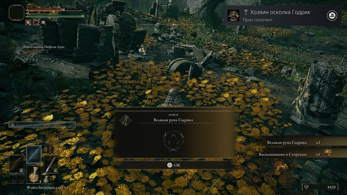 Как только её здоровье закончится, бой перейдёт во вторую «классическую» стадию боя. За победу над боссом получим артефакты «Воспоминание о Полнолунной королеве» и «Великая руна Нерождённых».