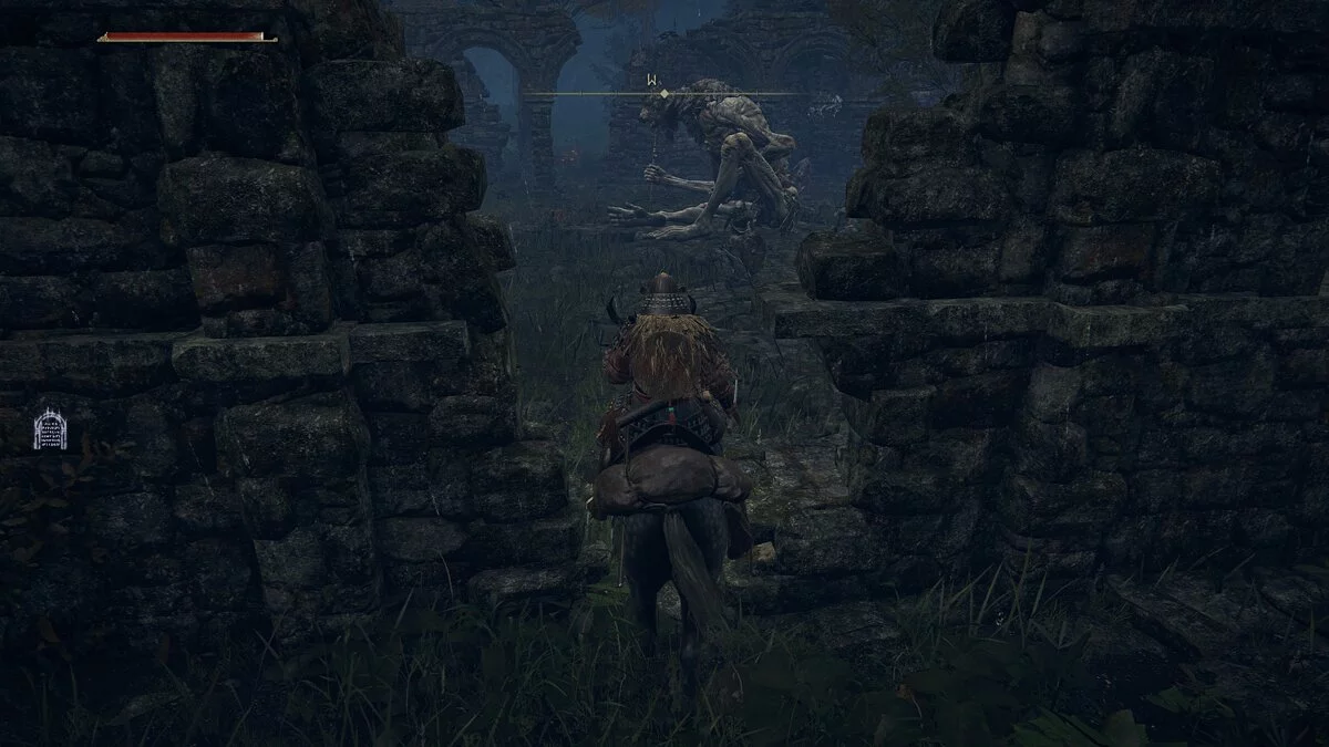 Возвращаемся к исследованию мира. Перемещаемся к месту благодати на развилке. Используем уходящую влево тропинку и уходим к замку Годрика. По дороге уничтожаем рыцарей и из шара достаём «Пепел войны: Дикие удары». Следуем по узкому туннелю, активируем место благодати и выбираемся на небольшую открытую локацию с боссом.