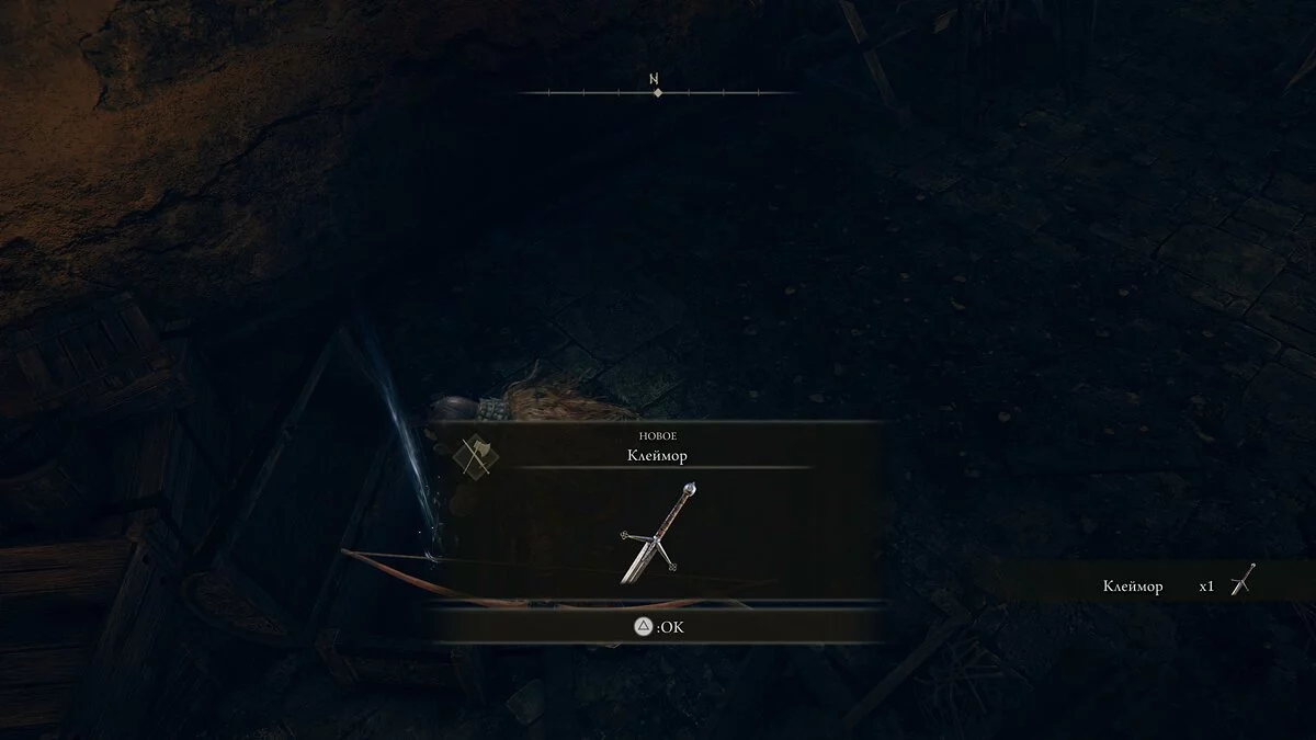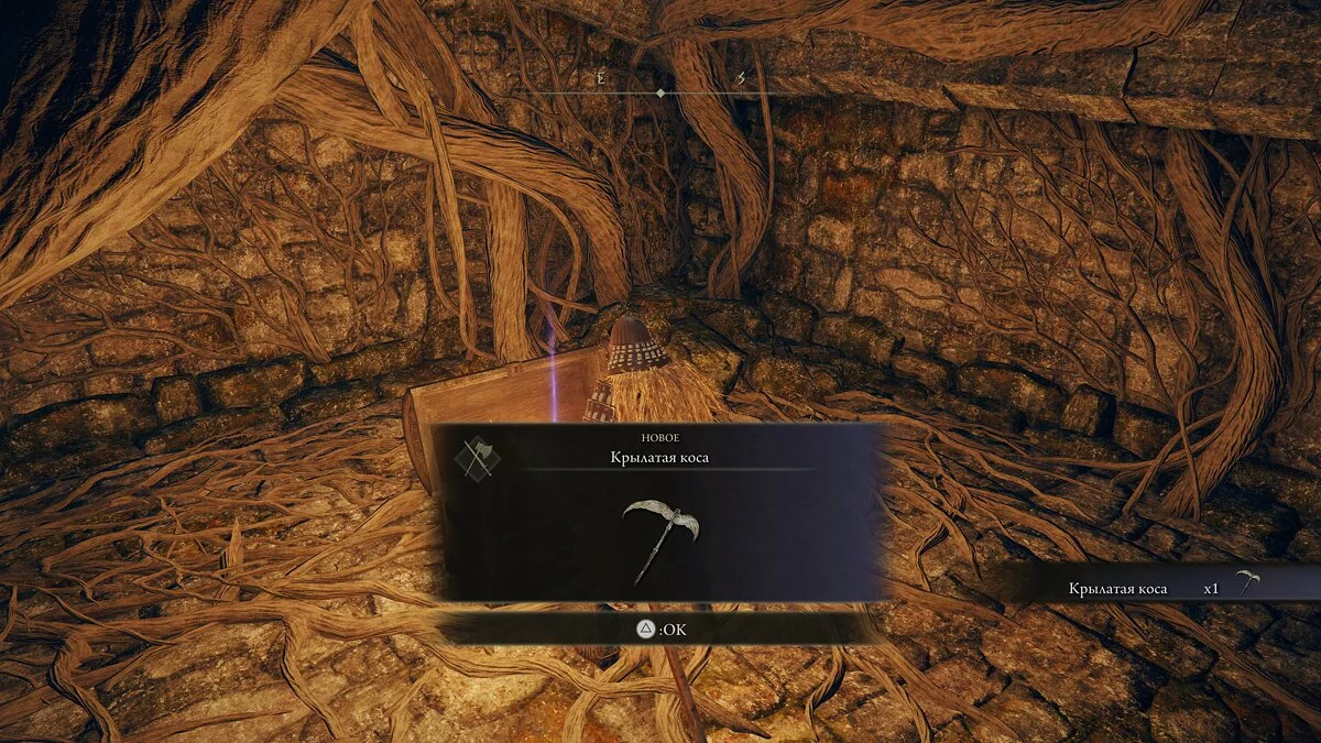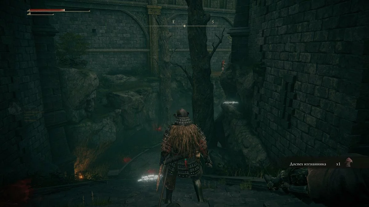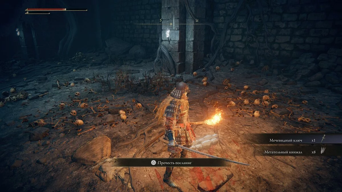 Осматриваем помещение — находим возле тела ржавый ключ и в сундуке талисман изогнутого меча. Спускаемся обратно и открываем ключом запертую дверь.