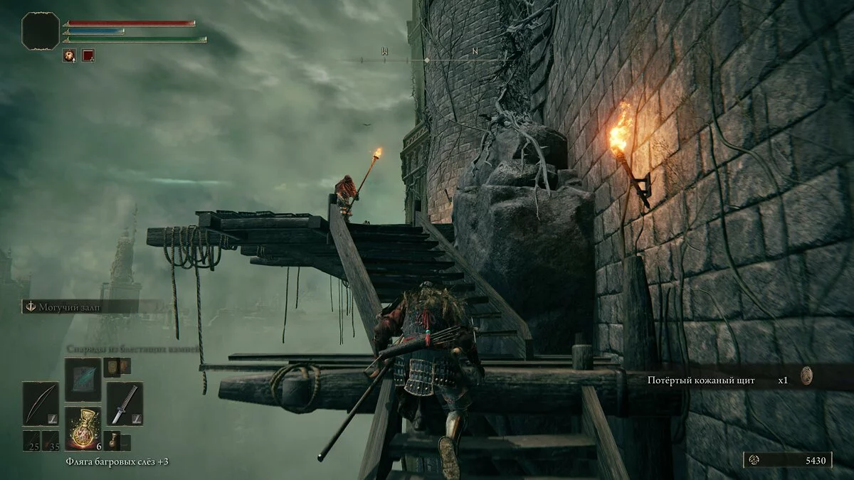 На первом этаже башни найдём «Крюки-когти». Поднимаемся по лестницам и аккуратно обходим бочки, иначе противники могут взорвать игрока. Забираемся на самый верх и находим запертую дверь. Открываем её и внутри помещения сталкиваемся с очень мощным рыцарем. Его можно аккуратно обойти и ударить со спины. После победы получим «Перчатки рыцаря-изгнанника».