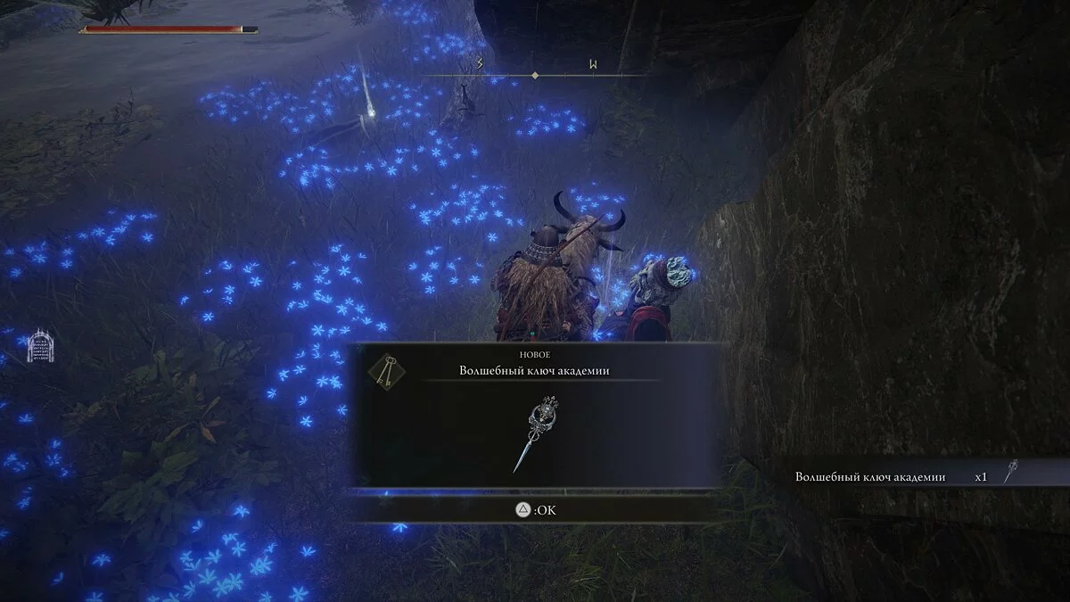 Найти предмет не составит труда — он спрятан около небольшой возвышенности на западе позади дракона. Побеждать мощного противника не обязательно, поэтому достаточно добраться до точки, схватить предмет и вернуться обратно к академии. Точное местоположение ключа расположено на скриншоте выше.
