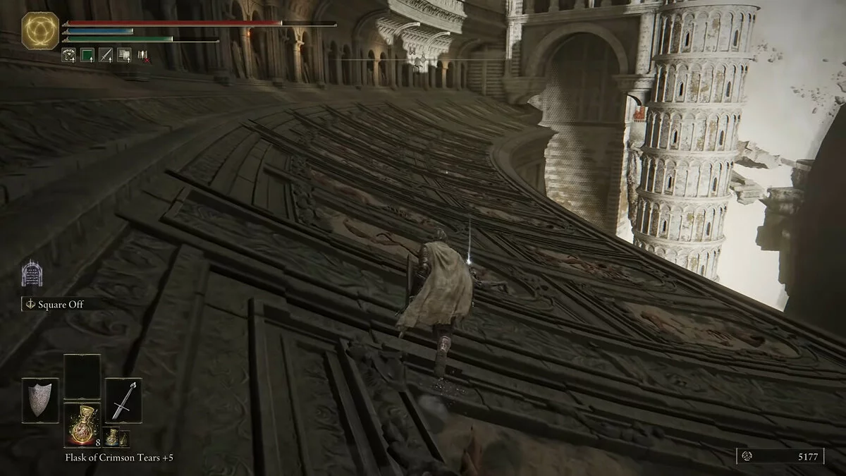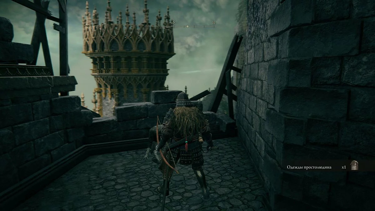 Поднимаемся ещё выше и находим большую башню. У входа стоит рыцарь с пикой. Побеждаем его или бесшумно его обходим. На следующем этаже найдём место благодати. Можем подняться наверх и спрыгнуть на соседние крыши в поисках добычи. Возле одной из башен найдём талисман когтя.
