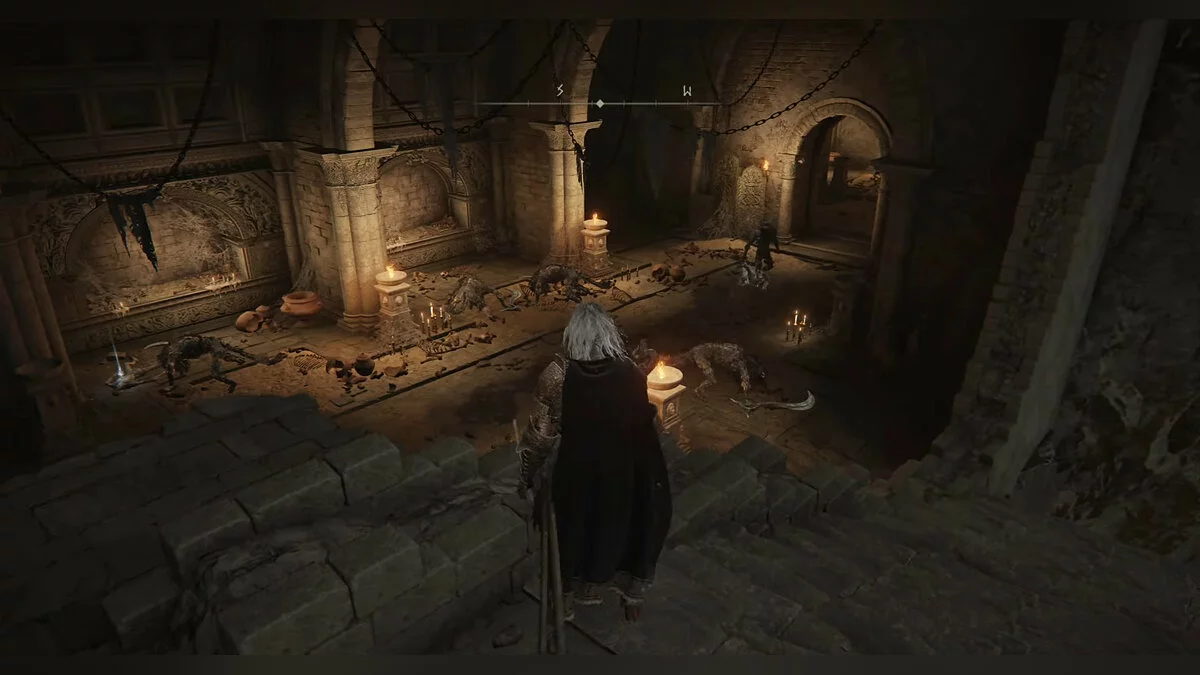 С помощью крыш игрок способен обойти большой открытый двор, но тогда герой потеряет дополнительный опыт для прокачки персонажа. От места благодати выходим наружу, побеждаем птиц и спускаемся по лестнице вниз. Здесь ходят мощный рыцарь и слабенький прислужник.