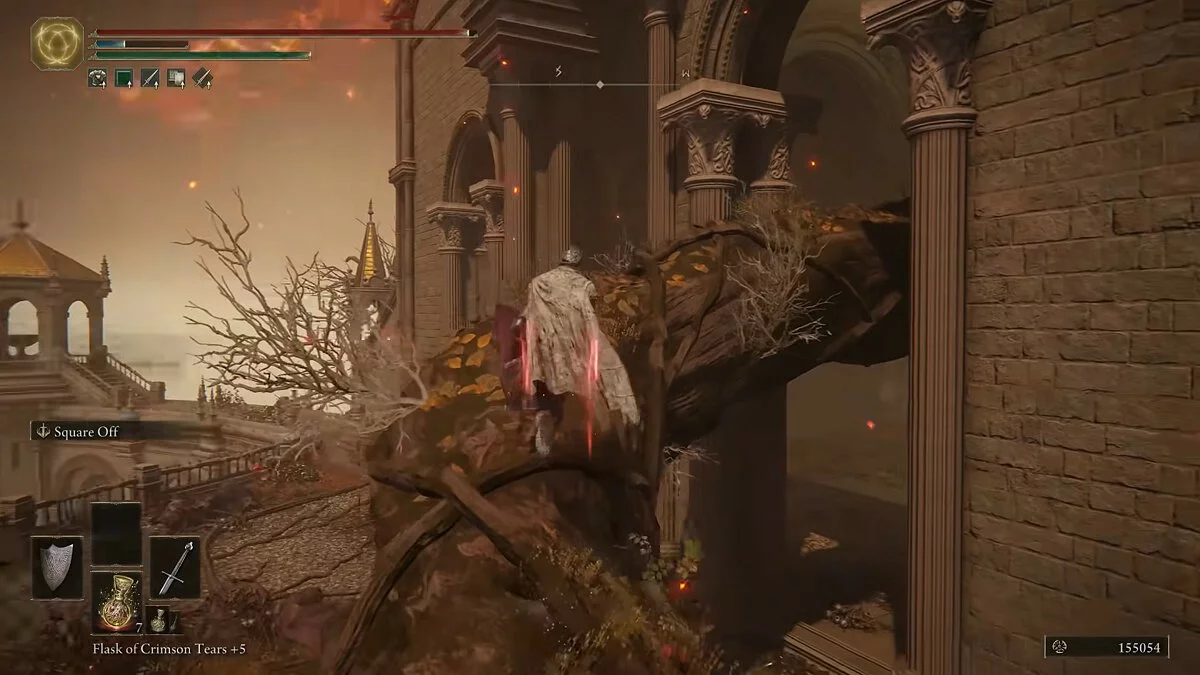 Поднимаемся по корню дерева на верхний уровень и проходим до следующего места благодати. По длинной лестнице снова доберёмся до трона Элдена.