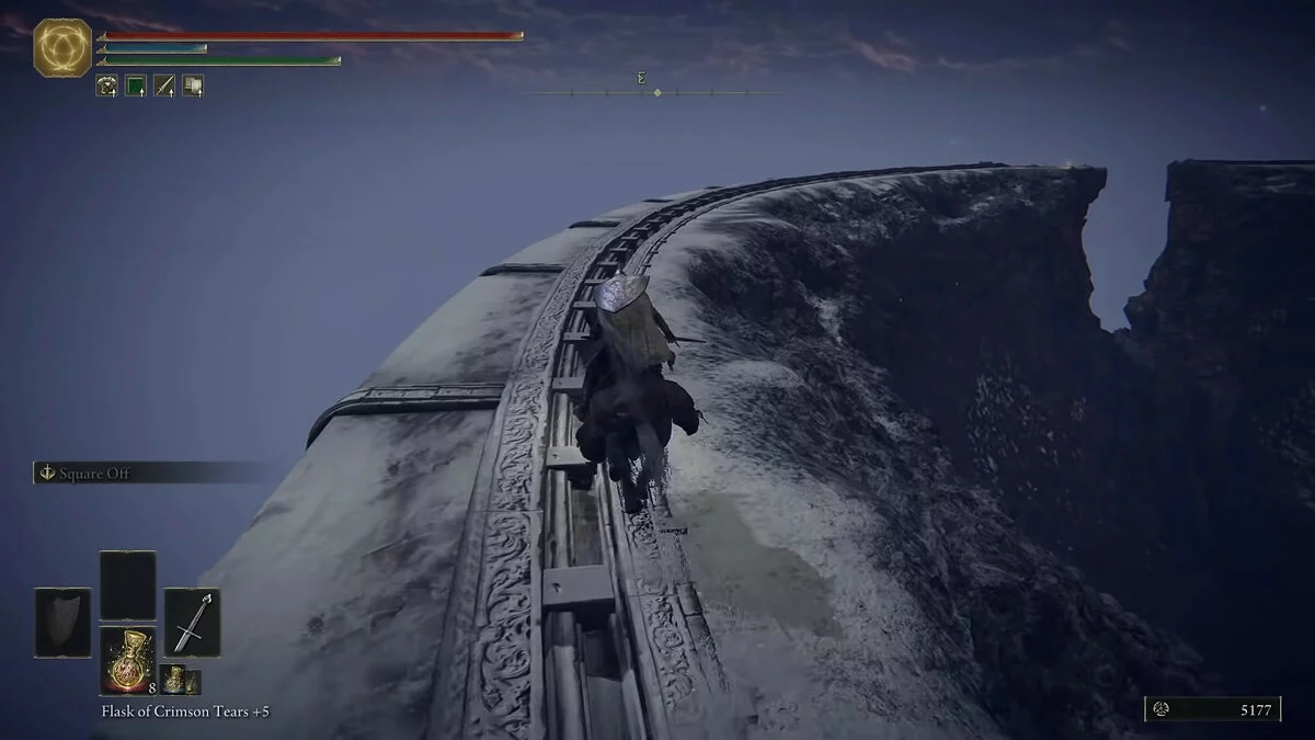 От места благодати следуем в арку налево и продолжаем путь по разным платформам. Перемещаемся по крышам строений и пробегаем через локацию с драконом. В конце пути используем подъёмник. Активируем место благодати и выходим на небольшой мост. В верхней части платформы игрока поджидает рыцарь на коне, убивать которого не обязательно. В качестве подсказки используйте скриншоты выше.