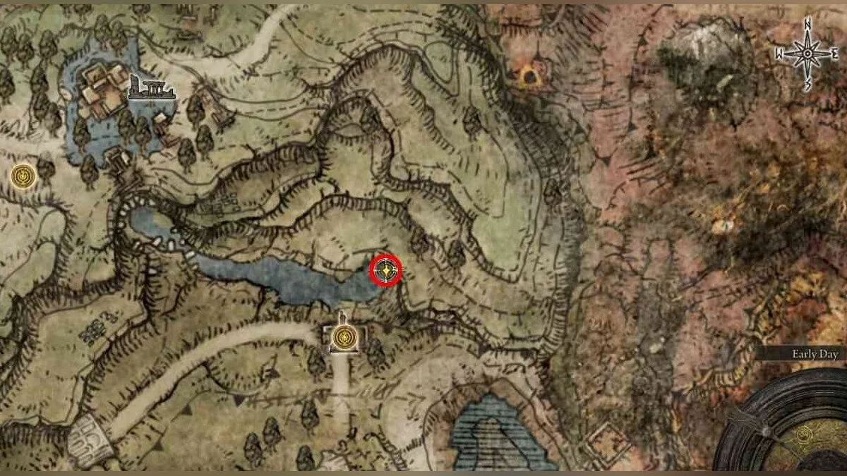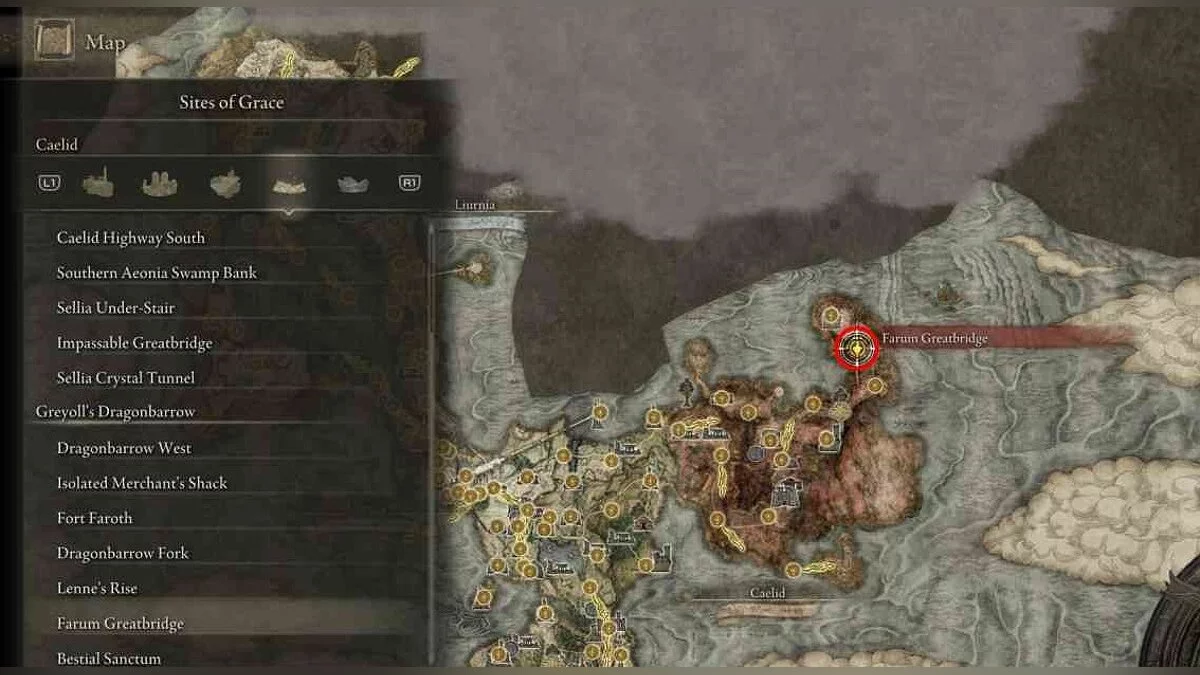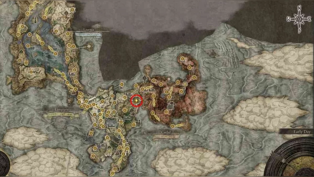 Телепортируйтесь к Драконьему кургану Грейолла (Greyoll's Dragonbarrow) на севере Кэлида (Caelid). Для этого доберитесь до Лимгрейва — Третьей церкви Марики (Limgrave — Third Church of Marika). К северу от этой постройки есть небольшое озеро. К востоку от водоёма, за кустами, находится портал. Используйте его.