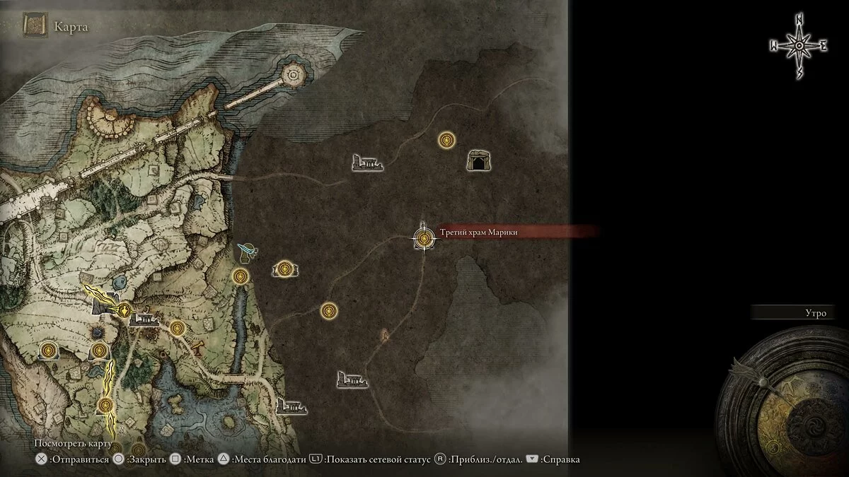 Двигайтесь, пока не увидите высокие развалины. Внутри вы найдете статую и костер. Место будет называться — Третий храм Марики. Отдохните там, чтобы запустить кат-сцену.