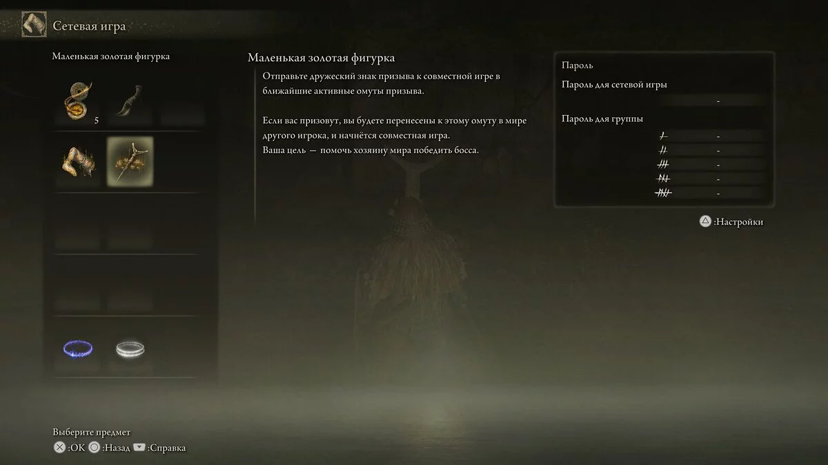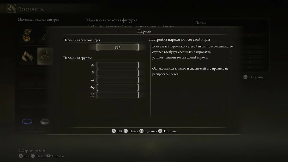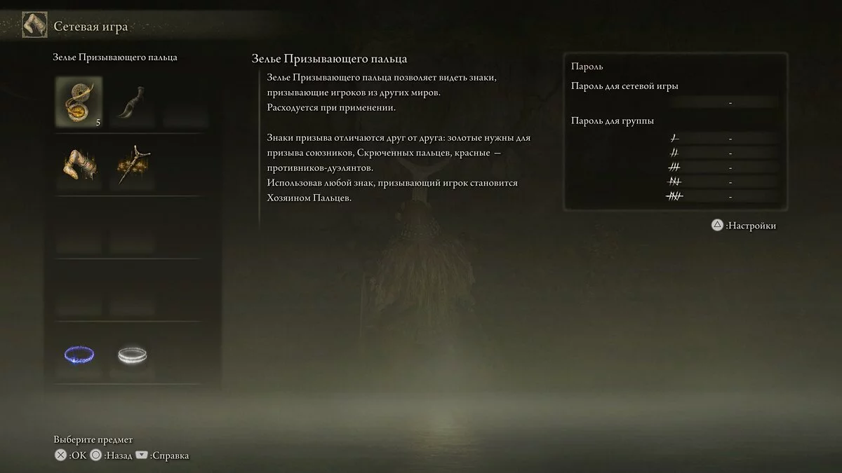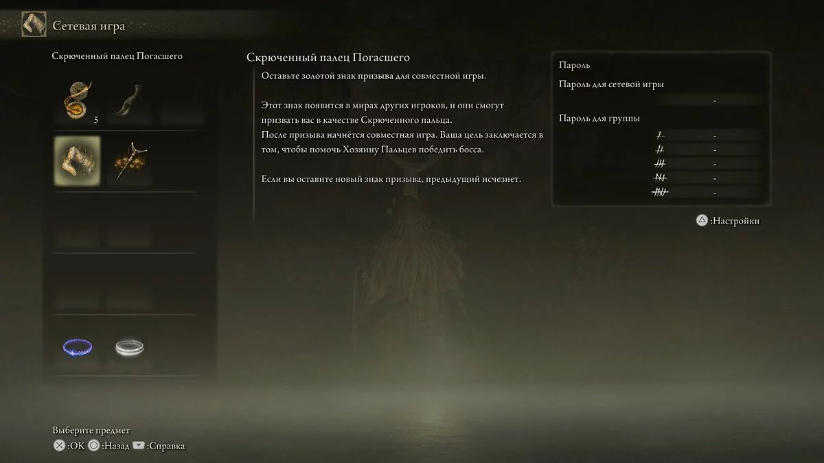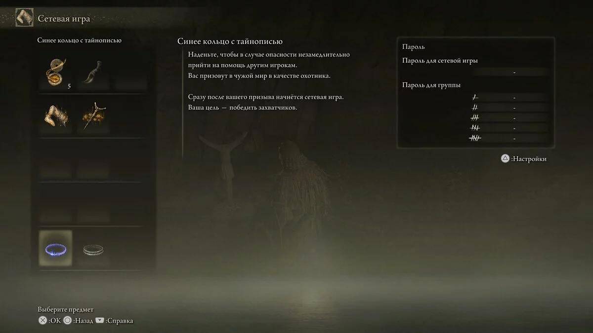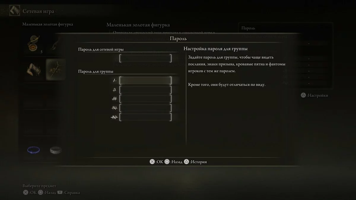 Учтите, что ограничения на присоединение к миру не действуют на захватчиков и спасителей. Также обратите внимание, что игрок может установить пароли для нескольких групп («Пароль для группы»), чтобы чаще видеть только их сообщения, фантомы, кровавые пятна и знаки призыва.