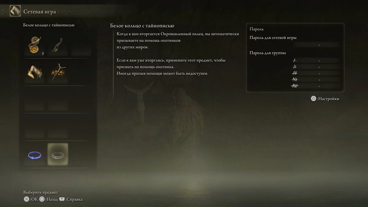 - Белое кольцо с тайнописью — при вторжении автоматически отправляет другому игроку сигнал о помощи. Приобретается в Круглом Столе.