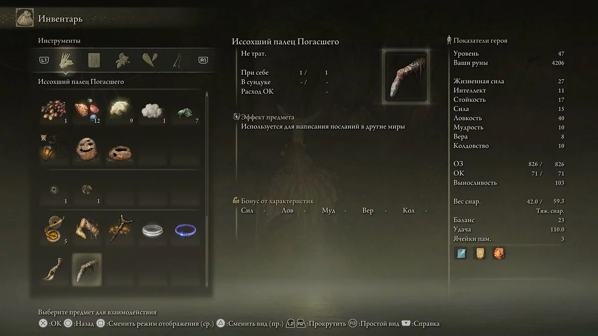 - Найдите в разделе «Инструменты» предмет «Иссохший палец Погасшего» и примените его. Отобразится окно «Послания».