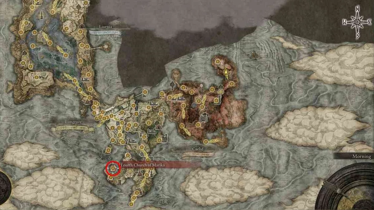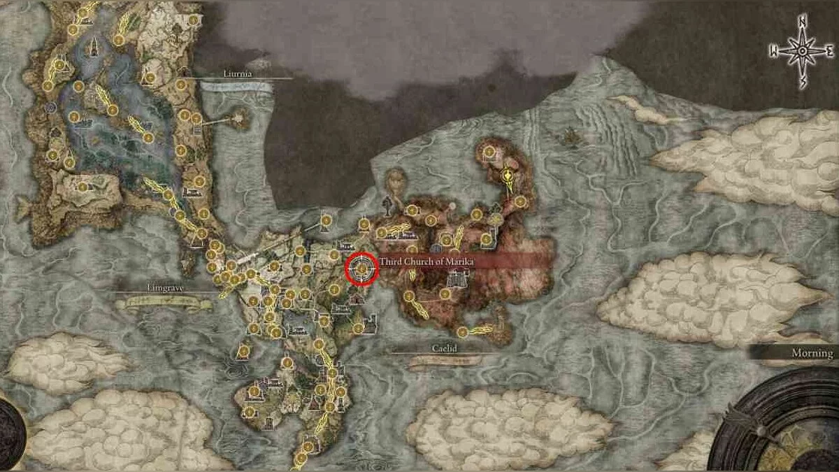 Священная слеза №1. Отправляйтесь в Лимгрейв — Третий храм Марики (Limgrave — Third Church of Marika). Когда окажетесь у места благодати, посмотрите на север. Вы должны увидеть статую. Слеза лежит у её подножия.