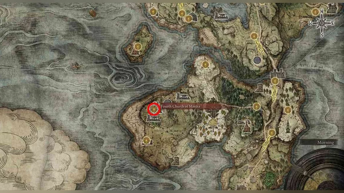 Священная слеза №2. Двигайтесь на Плачущий полуостров (Weeping Peninsula). Вам нужно посетить Четвёртый храм Марики (Weeping Peninsula — Fourth Church of Marika). Священная слеза лежит у основания статуи.