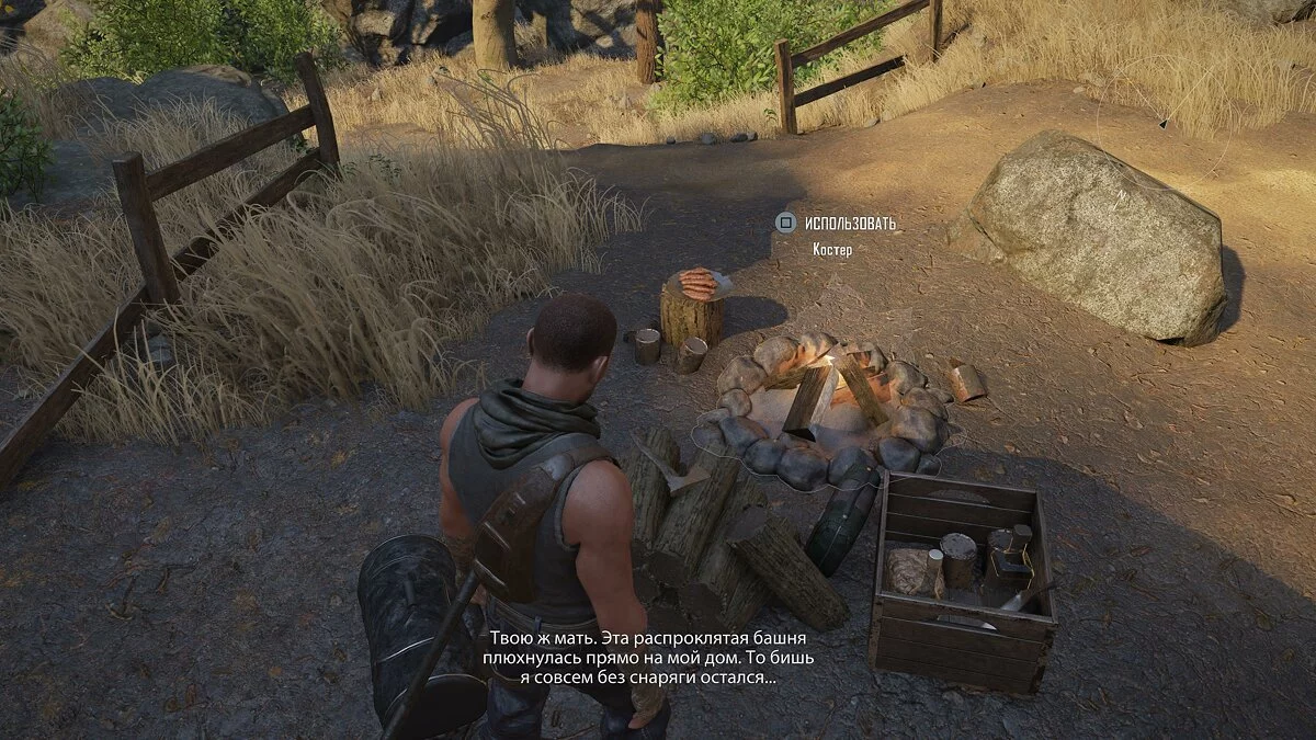 После просмотра вступительного видеоролика появляемся в игровом мире. У костра находим полезные предметы. Здесь же можем приготовить первую еду — «жареное мясо».