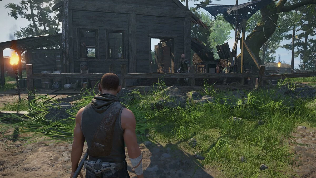 Идём к метке и разговариваем с Гардоком. Предлагаем ему защиту и отправляемся на поиски инструментов. Молоток строителя проще всего найти по северо-западной метке. Убиваем парочку зверей и забираем инструмент. Открываем карту и используем кнопку для быстрого возвращения в лагерь.