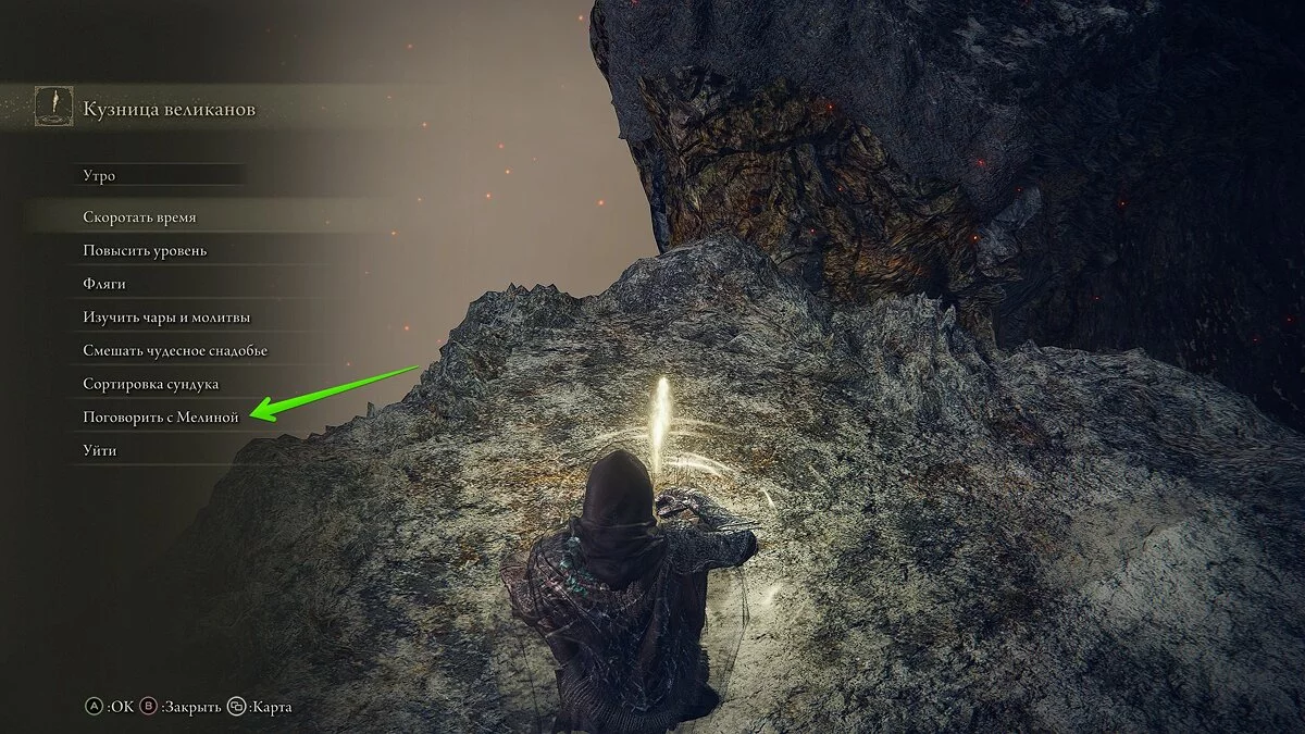 Пройдите по краю строения и доберитесь до одноимённого места благодати. Взаимодействуйте с ним, чтобы призвать Мелину. Стоит отметить, что кат-сцена не начнётся автоматически. Вам нужно выбрать пункт «Поговорить с Мелиной» из списка доступных опций.