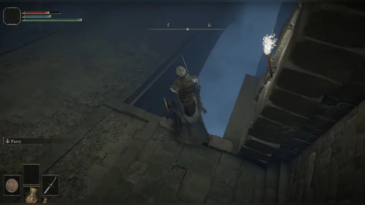 Возвращайтесь к началу подземелья и двигайтесь вперёд, пока не увидите «мост» — место, где по бокам отсутствует пол. Однако справа есть возможность спуститься вниз.