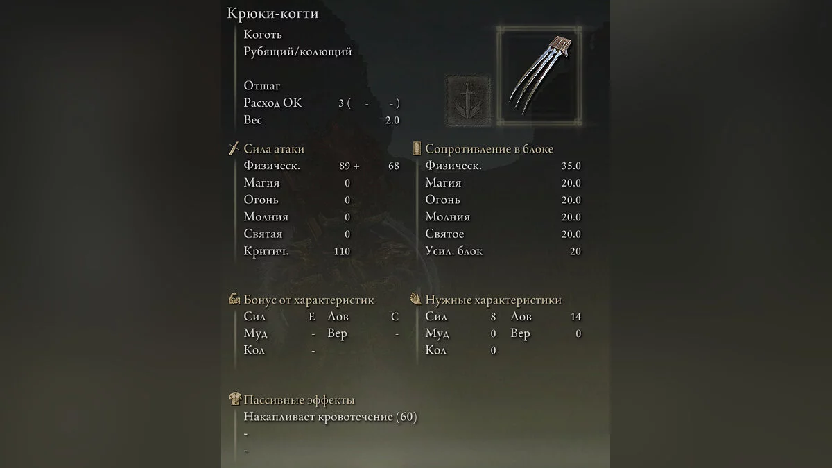 Когти. Как и кулаки, рекомендуем надевать когти на обе руки. Идеальный вариант для стремительных атак на короткой дистанции. Это лёгкое оружие, которое накладывает эффект кровотечения и отлично подойдёт для билда через ловкость.