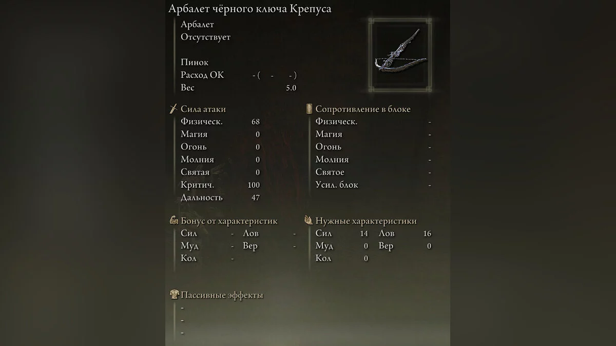 Если ищите альтернативу лукам, попробуйте Арбалет чёрного ключа Крепуса. Это хорошее оружие для дальнего боя и прицельной стрельбы, которое не зависит от каких-либо характеристик. Найти его можно в Крепости Круглого стола. Для этого спуститесь в помещение слева от кузнеца Хью и откройте дверь гаргульи с помощью мечевидного ключа, в сундуке и будет лежать нужный арбалет.