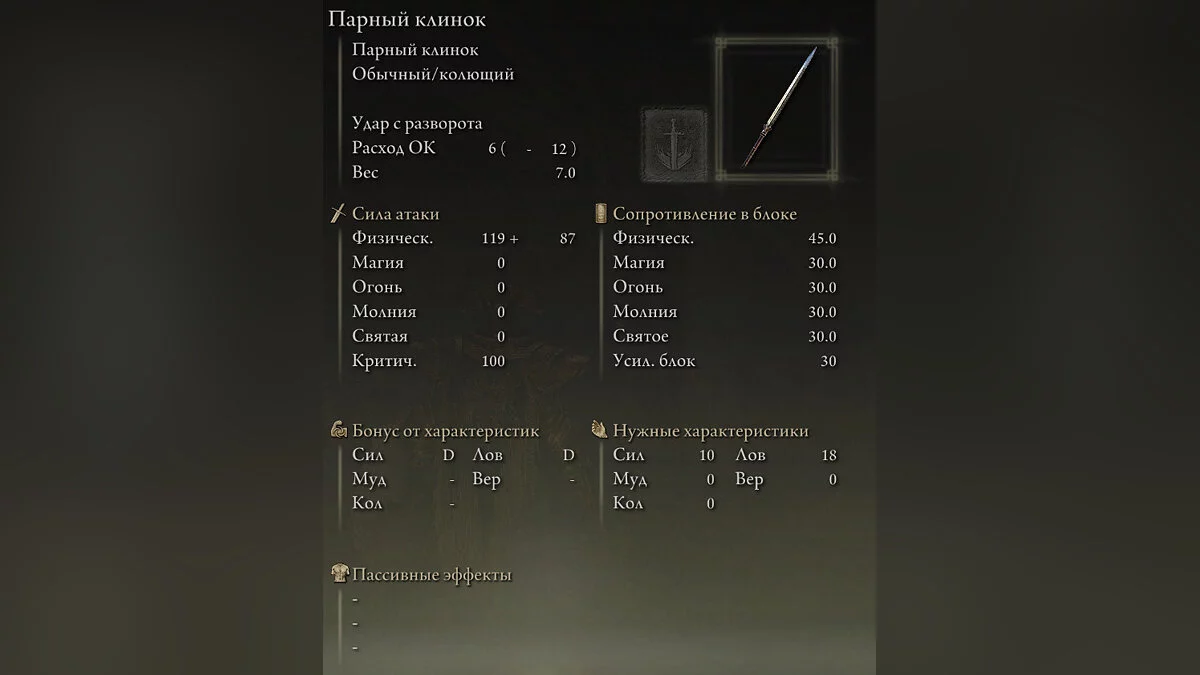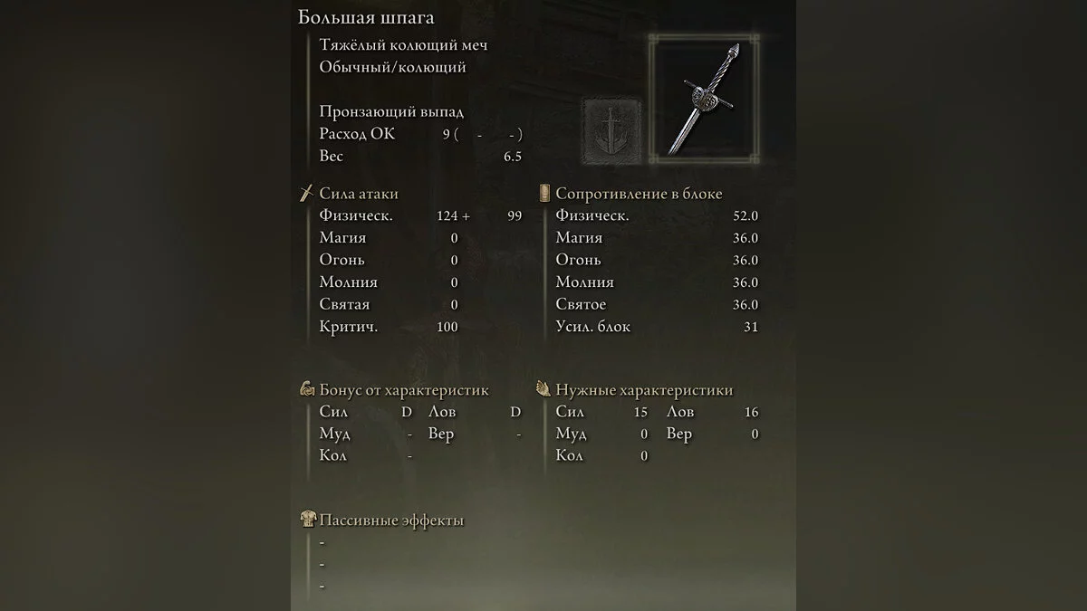 Пока что в игре нам встретился только один тяжёлый колющий меч — Большая шпага. На его бонусы преимущественно влияют сила и ловкость, а навык «Пронзающий выпад» позволяет пробить щит врага. Найти Большую шпагу вы сможете в лагере с большим количеством врагов южнее по дороге от «Руин поселения», в сундуке под навесом.