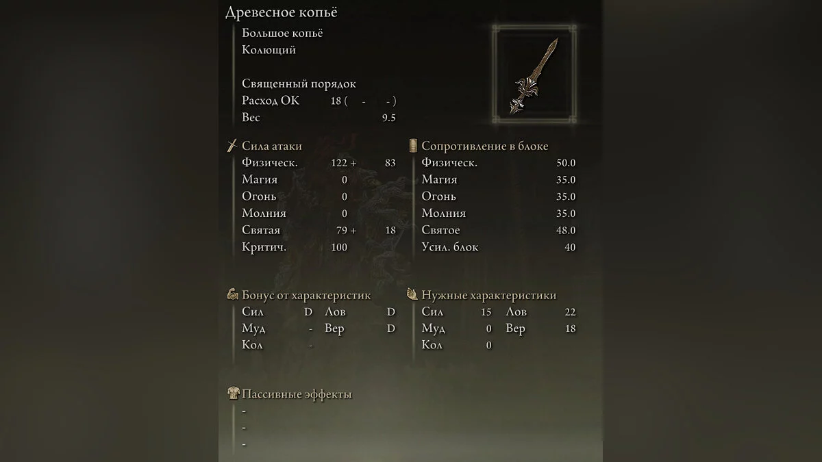 Для ознакомления подойдёт Древесное копьё, найти которое можно в повозке на обрыве моста к югу от места благодати «Южный тракт Лиурнии». На его урон влияют сила, вера и ловкость. Сопутствующий навык «Священный порядок» будет особенно эффективен против нежити.