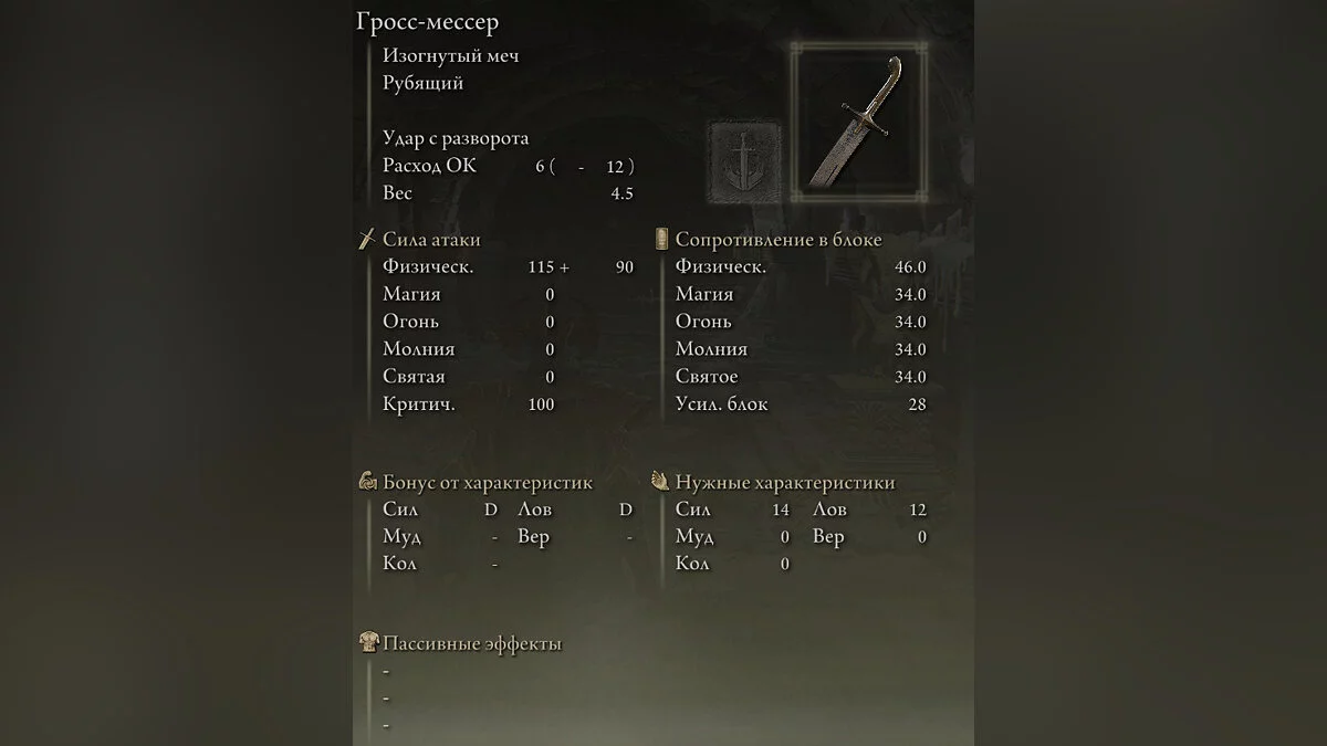 Отличным вариантом изогнутого меча будет Гросс-мессер. Он выпадает с противников-скелетов, например, в локации Ведущие в гробницу катакомбы, на Плачущем полуострове. Его урон в первую очередь зависит от силы и ловкости. Гросс-мессер лучше всего использовать в связке со щитом, способным парировать удары врага. Обладает навыком «Удар с разворота» и может быть усилено Пеплом войны.