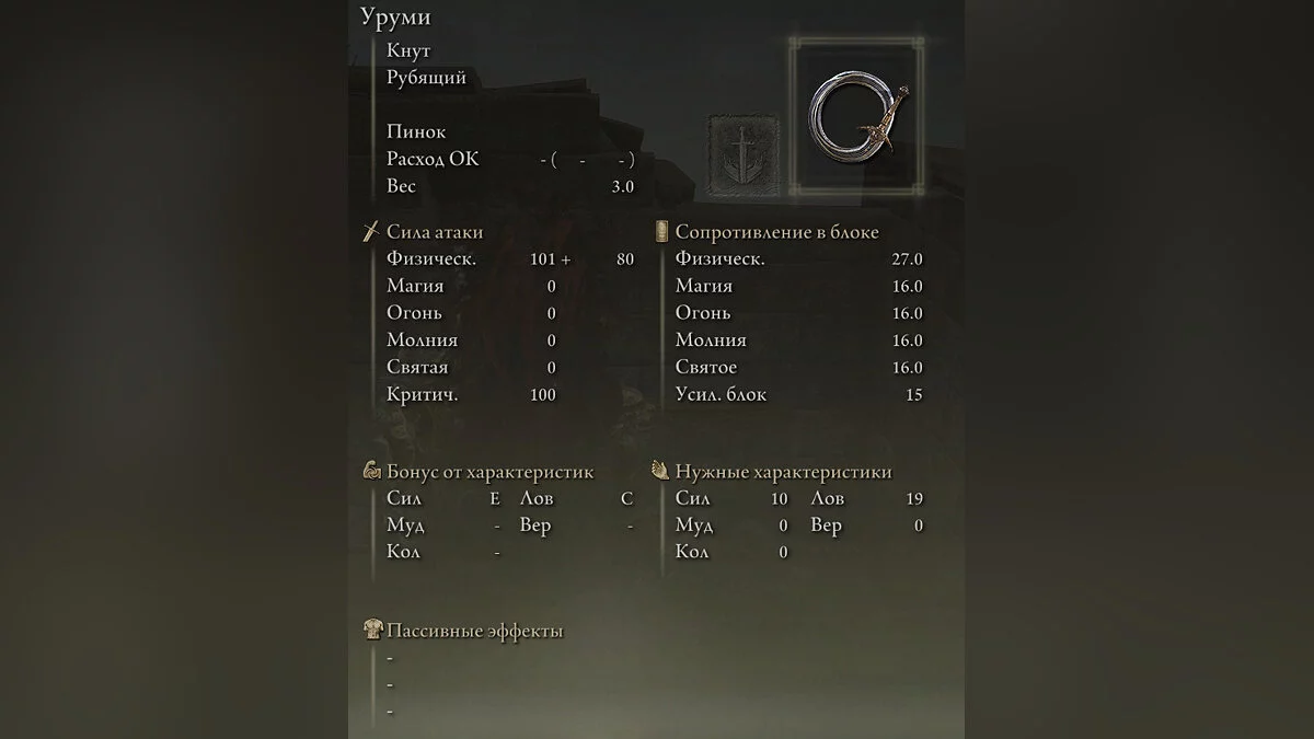 Любой тип оружия в Elden Ring может иметь один или сразу несколько видов урона. Возможно, вы замечали в инвентаре, что под названием предмета указан вид наносимых повреждений (колющие, режущие, рубящие и т.д.). Важно знать какие виды урона наносит выбранное вооружение, так как ряд врагов менее или полностью невосприимчив к разным типам урона.