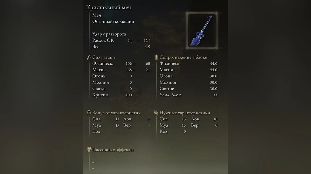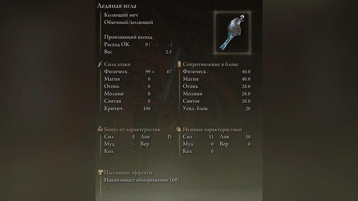 По нашему мнению, лучшим вариантом является меч Ледяная игла, который скейлится от силы и ловкости. Он позволяет наносить колющие удары, игнорируя щит врага. А навык «Пронзающий выпад» способен пробить блок противника. Ледяная игла также накладывает эффект обморожения на цель. Найти меч можно в локации Руины королевских владений, в Озёрной Лиурнии. Потребуется найти иллюзорный пол рядом с сидящим призраком и победить босса Королевский Призрак, чтобы получить доступ к комнате с сундуком.