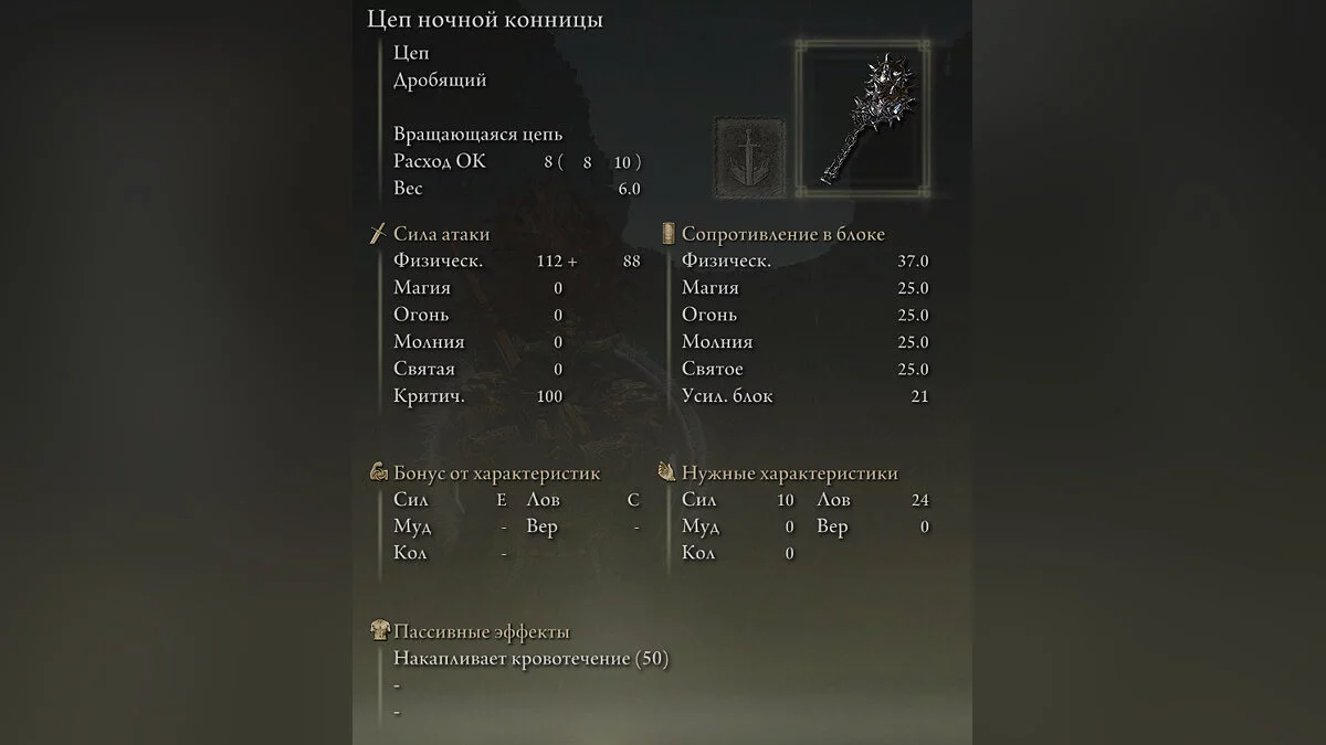 Рекомендуем в первую очередь попробовать Цеп ночной конницы. Он выпадает с ночных всадников около места благодати «Башня замка Морн». Сила и ловкость повышают эффективность этого оружия. Указанный цеп также вызывает кровотечение и требует высокого показателя ловкости персонажа.